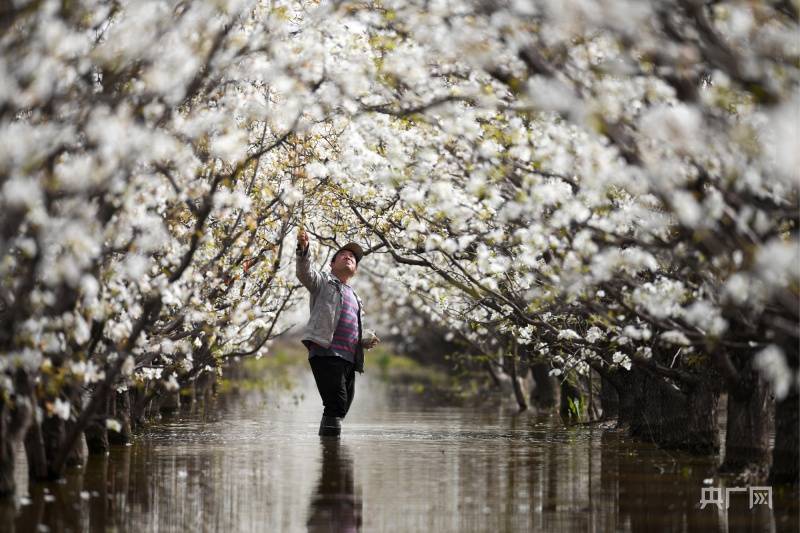 盛开的梨花倒映在水中,如诗如画(央广网发 刘亮亮 摄)