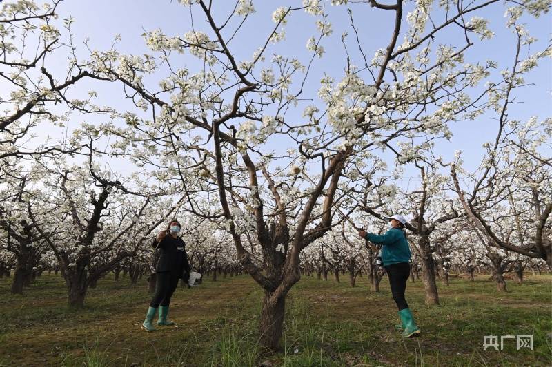 南安村村民在为梨花授粉(央广网发 刘亮亮 摄)