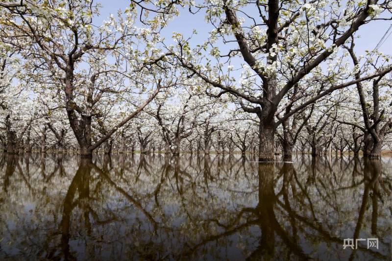 盛开的梨花倒映在水中,如诗如画(央广网发刘亮亮摄)