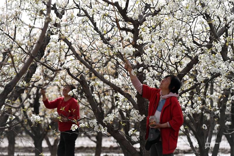 南安村村民在为梨花授粉(央广网发刘亮亮摄)