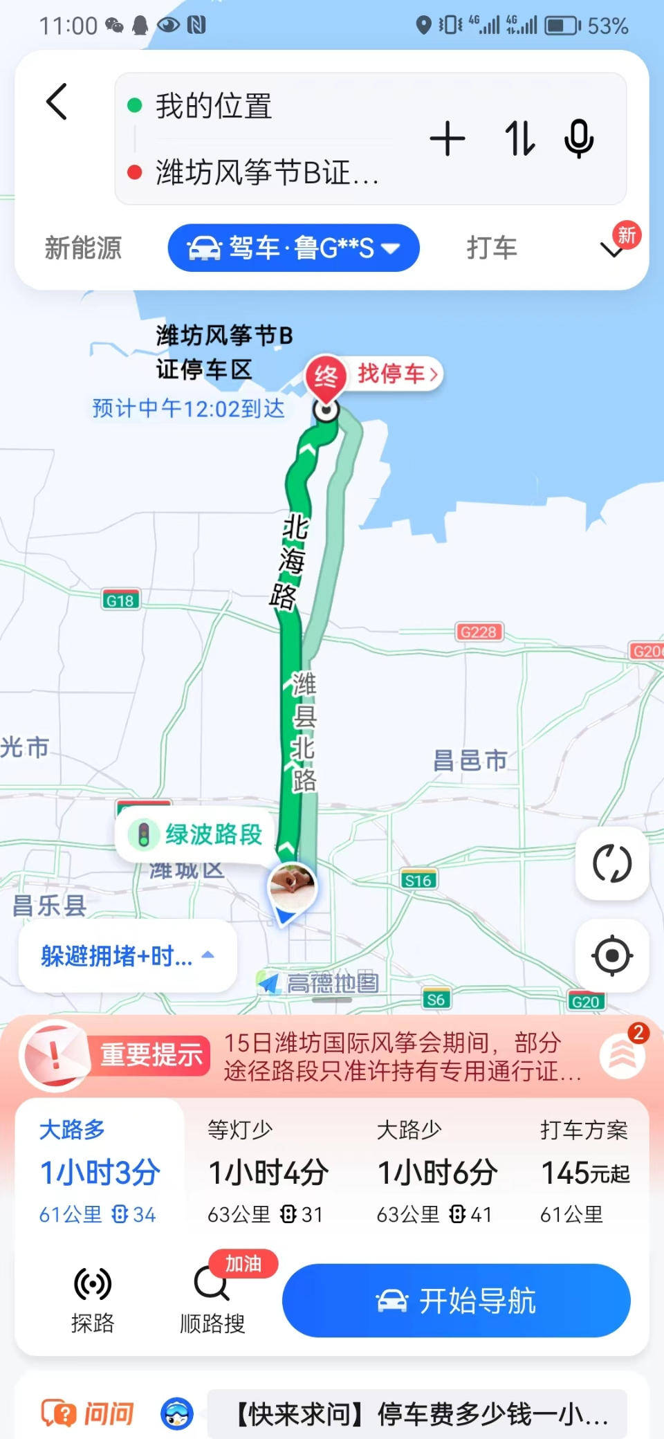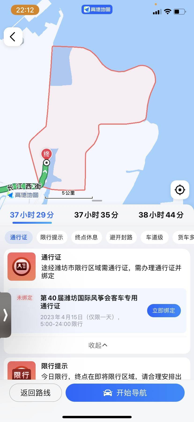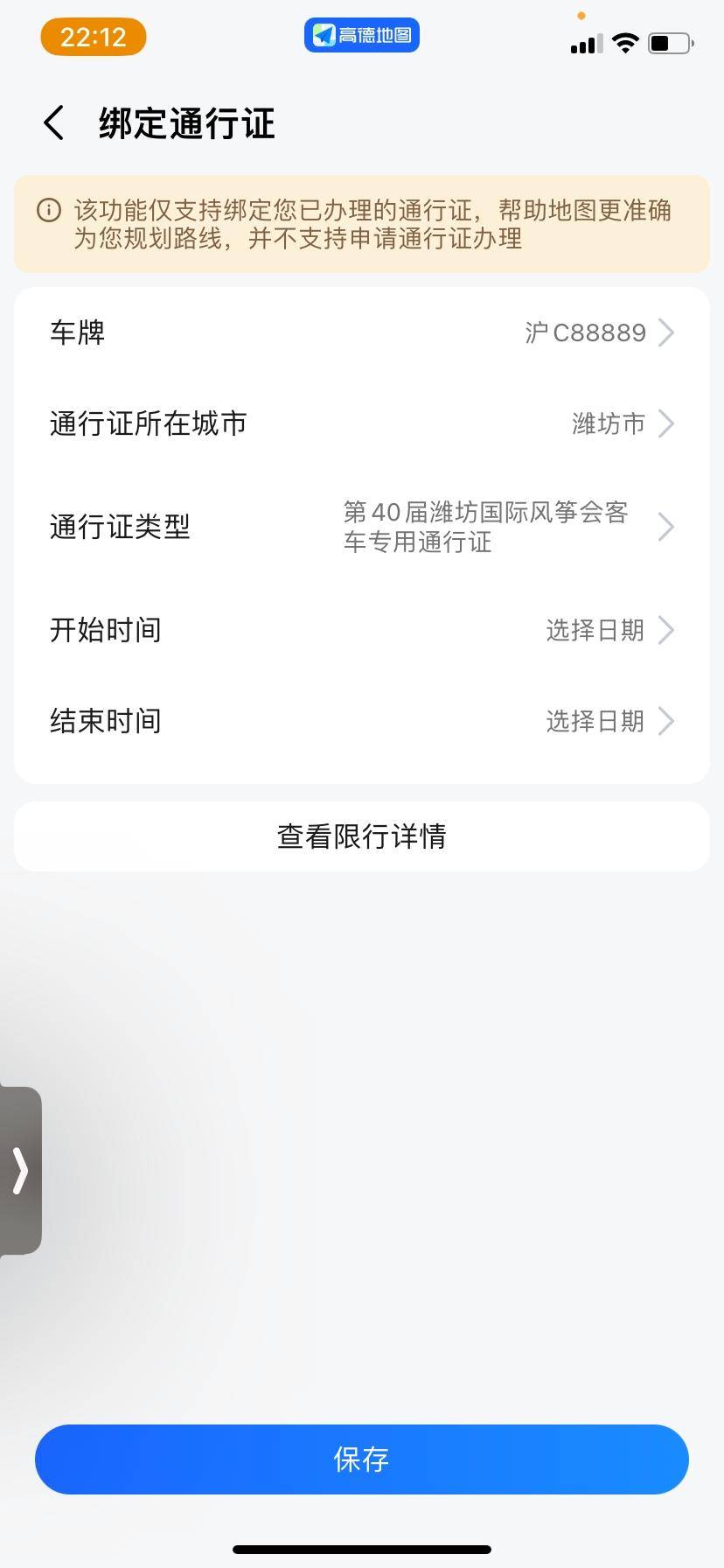 活动期间,风筝会核心管控区域内只准许持有专用通行证的车辆通行。当用户通过高德地图规划导航前往会场时,导航会提示并引导用户绑定通行证信息。绑定通行证信息后,点“开始导航”后,根据导航指引前往会场即可。行驶到会场时,导航语音播报也会协助引导AB证车辆前往对应的停车场。