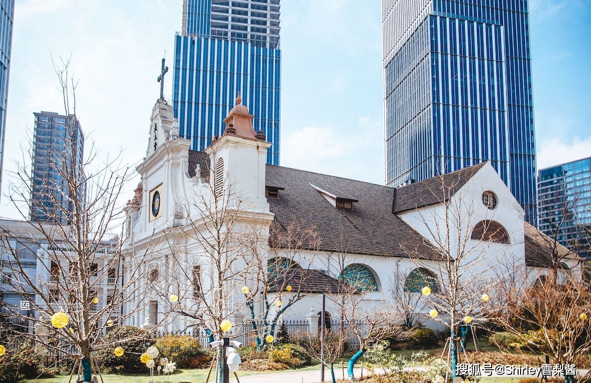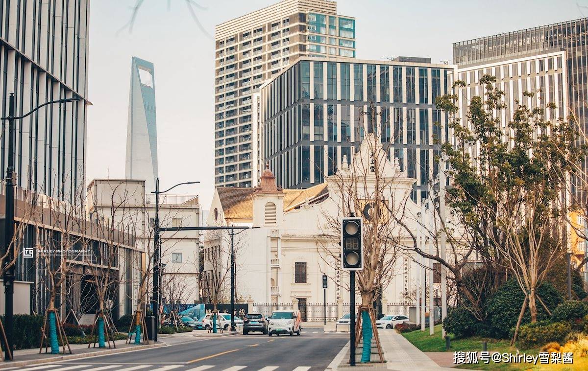 如果沿着教堂的反方向走远一些,还能拍到上海中心与环球。上海最古老的教堂与最高的大楼同框,古今交融的画面,也是这座城市独具魅力的一面。