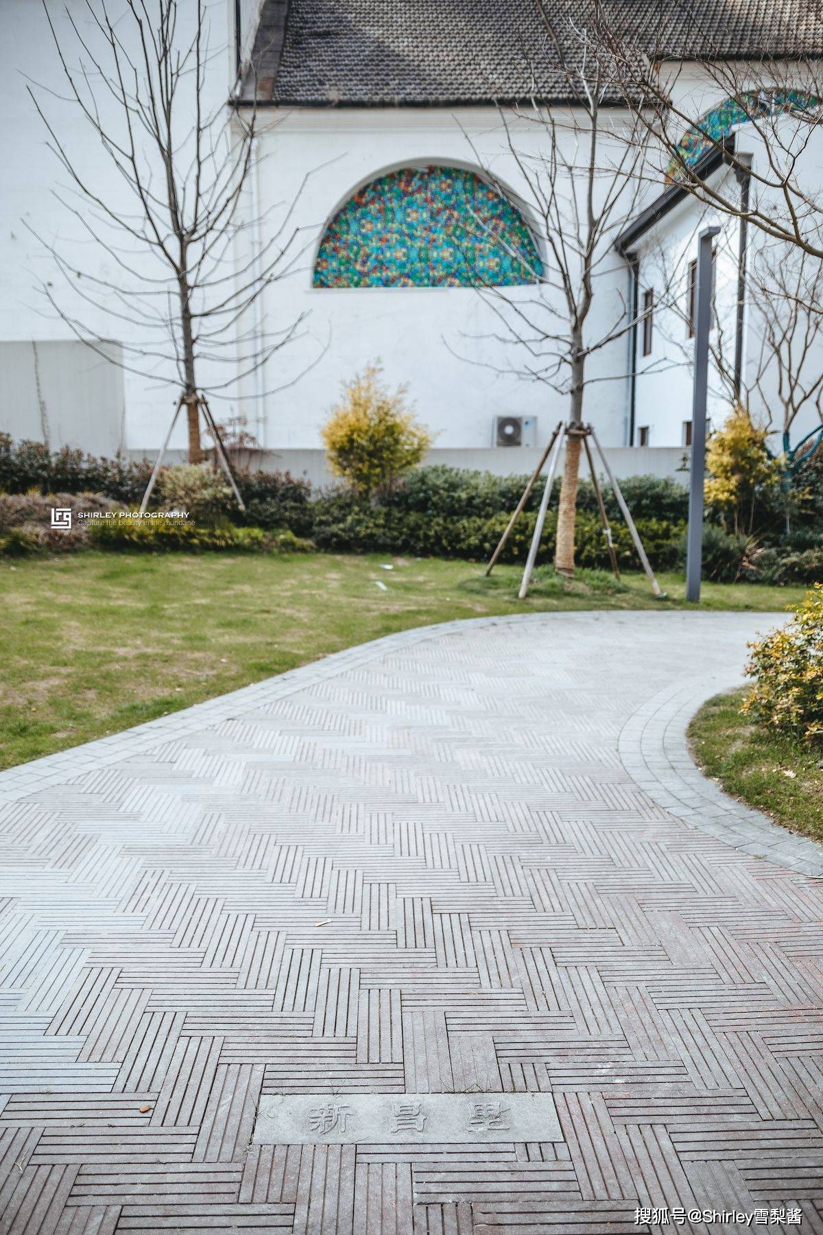 教堂侧面的绿地明显是经过设计,风格时尚的路灯、过去弄堂门头的老砖在此新旧碰撞,并与一旁的商场绿地外滩潮方连成一片。站在商场的二层平台,也能以一个相对高一些的视角,来欣赏这座教堂的侧面。