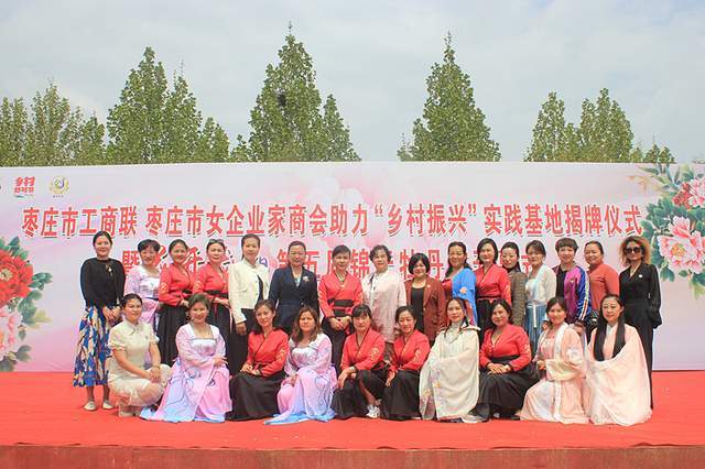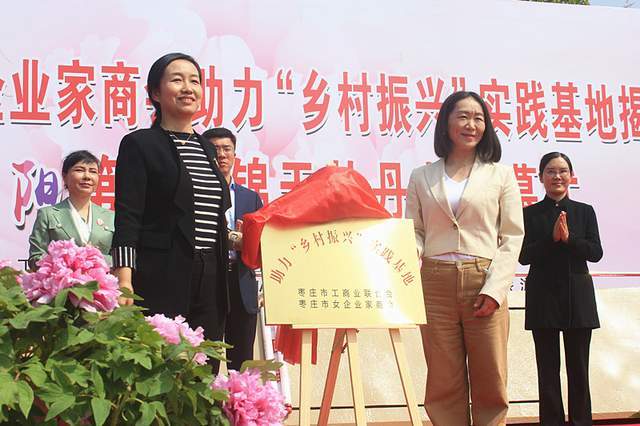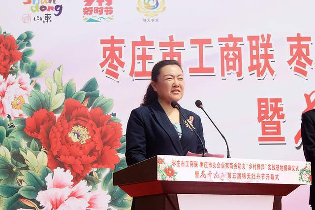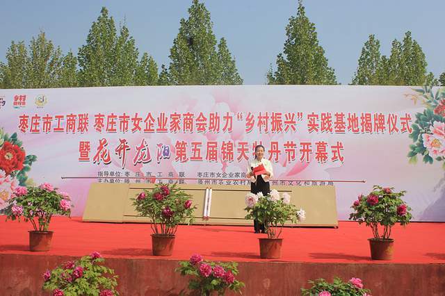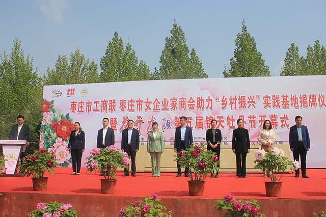 开幕式上,枣庄市工商联主席李慧和滕州市工商联主席乔令梅为“乡村振兴”实践基地揭牌,主席台领导共同启动第五届锦天牡丹节开幕启动柱。