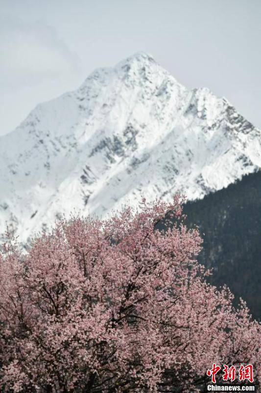图为桃花盛放,远处雪山映照。贡嘎来松 摄