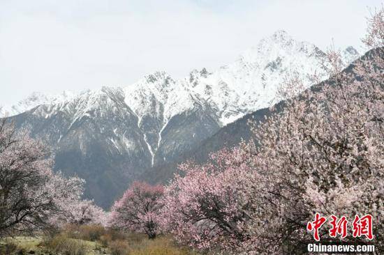 当地农牧民靠着“桃花旅游”增收。这里紧邻国家森林公园、国家5A级旅游景区巴松措,是很多游客必打卡之地。图为桃花盛放,远处雪山映照。贡嘎来松 摄