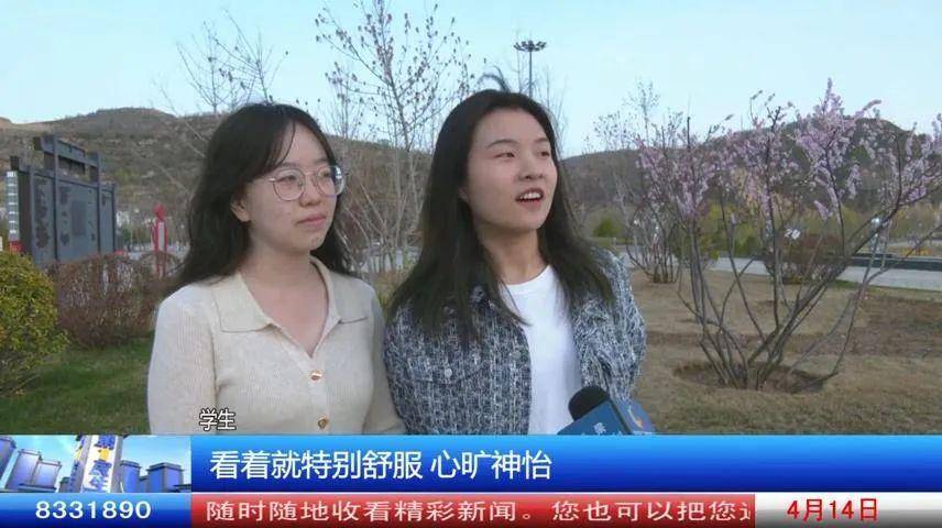 学生:我们是从吕梁学院过来的,前两天就想过来玩一玩,但是一直下雨,所以今天才来。刚刚去坐了船,感觉还挺舒服的,水也挺清的。花最近都开了,看着就特别舒服,心旷神怡。