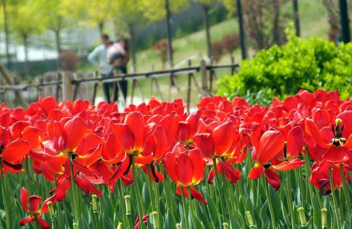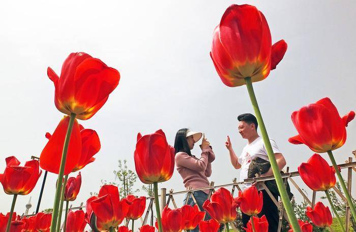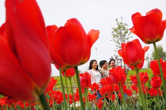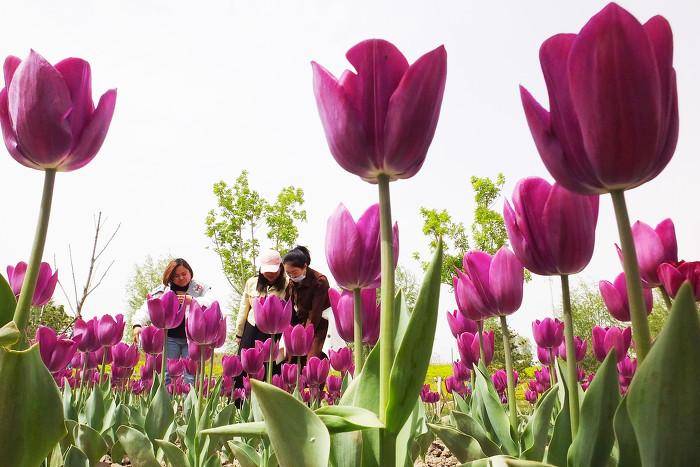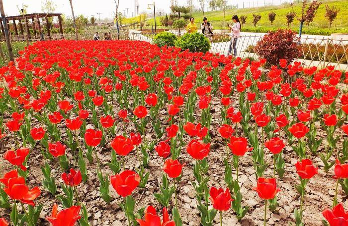 4月12日,运城市新绛县汾河生态公园里,花香四溢,美不胜收。红色、紫色、黄色郁金香争奇斗艳,争相开放。吸引着众多市民和游客赏花观光,拍照打卡。