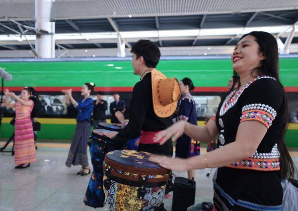站台上还进行了舞蹈表演,乘客们在欢快的鼓点伴奏下,登上了列车。