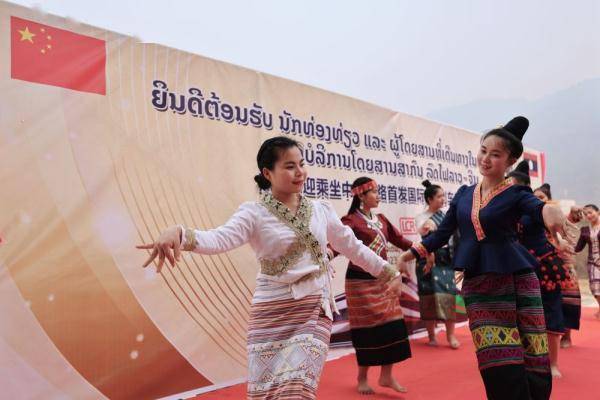 走出海关的大厅,我们的第一个感受就是热,首先是室外的天气热,天气预报显示当时的温度是41摄氏度。然后是老挝人民的热情。老挝的工作人员给每一位出站的旅客带上占芭花的花环。老挝方面在火车站的广场上搭了一个舞台,演员在台上载歌载舞。老挝新闻文化与旅游部部长SuanesavanhVIGNAKET在老挝磨丁站迎接中国旅客。她在致辞里说:“中老铁路国际旅客列车的开通是老中两国始终相互鼓励、相互帮助共同建设富强国家的重要历史事件。这一天的活动将载入老中两国友好合作以及老中两国命运共同体合作的史册,直到永远。”