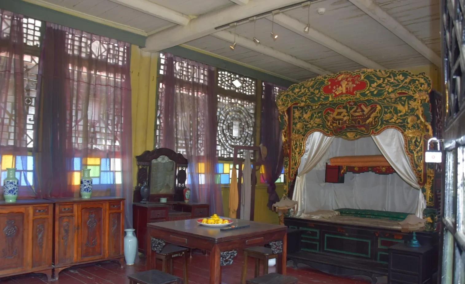 老公馆正门内东侧一角的小姐楼,又称“绣楼”,为院中之院,建得高于宅院屋面,六面六角,攒尖屋项,精致小巧,十分风雅,但也光线良好,视野开阔,可俯视庭院,可遥望田野,且极具私密性,是我国建筑文化中少有的一朵约丽的小花,蕴涵了浓厚的半封建半殖民地文化,可惜的是现在也已经大门紧闭。隔门缝打望一眼,好像堆了不少的枯枝杂物,让游人不无遗憾。