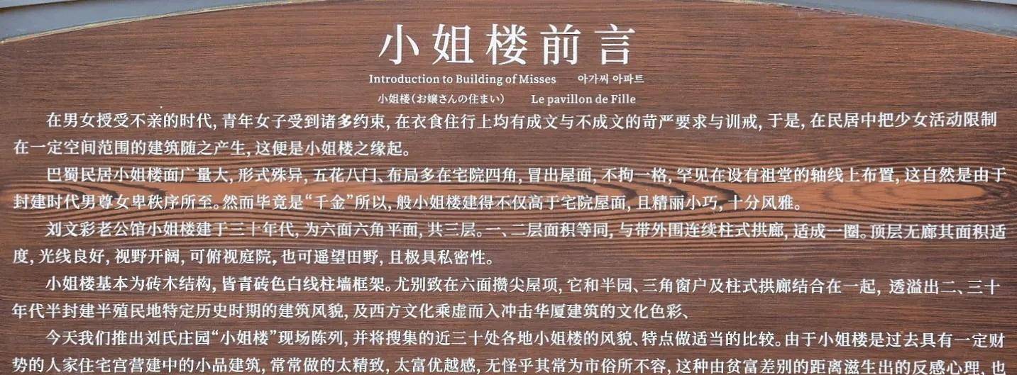 博物馆陈列分为五个部分:庄园老公馆刘文彩及其家人生活现场的复原陈列、川西民俗博物馆民俗陈列、庄园文物珍品馆馆藏精品陈列、刘氏祖居复原陈列、川西民居雕刻和近现代书画陈列。
