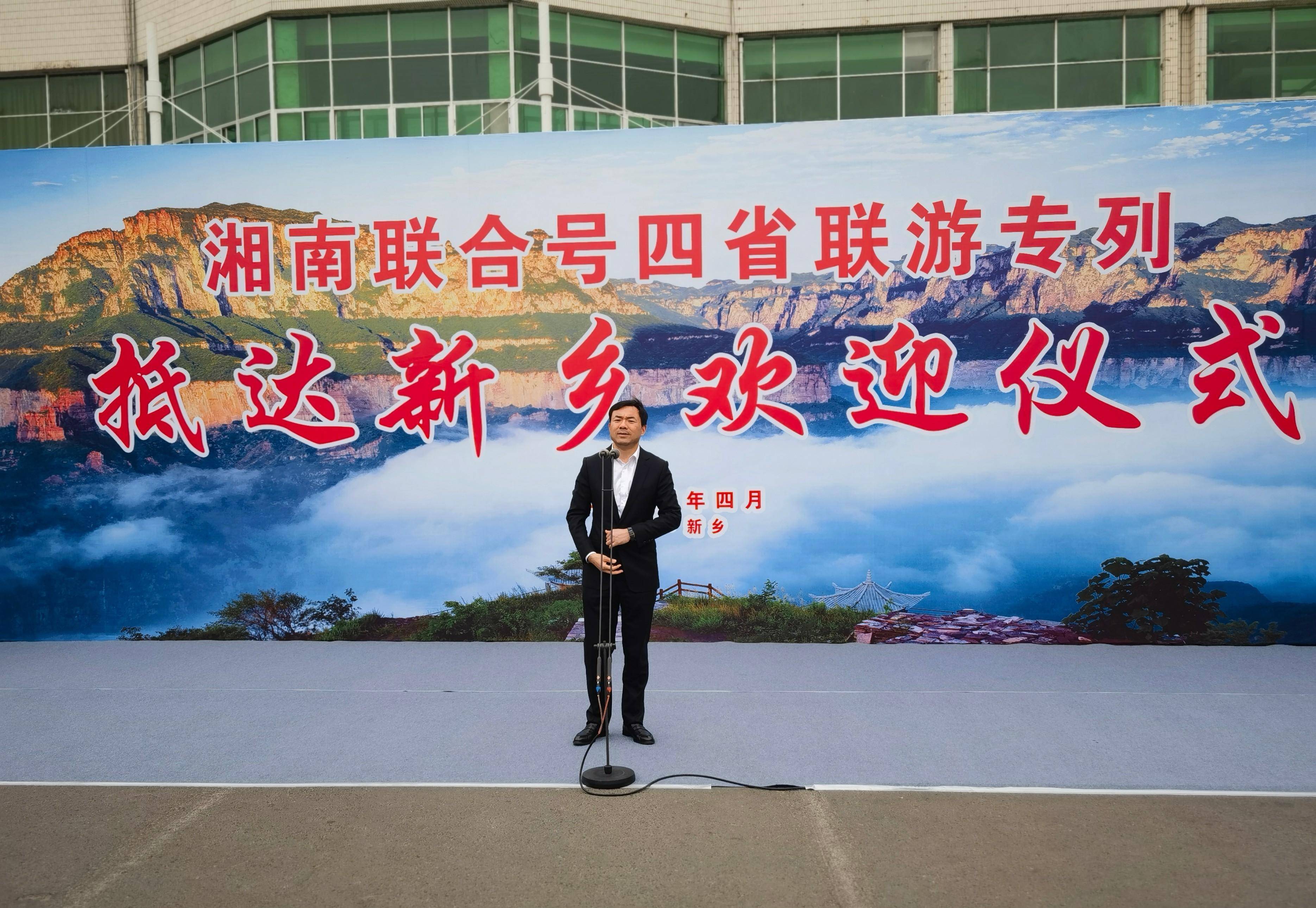 新乡市文旅局联合新乡南太行旅游集团在火车站站前广场举行了隆重的欢迎仪式,新乡市政府副市长、辉县市委书记刘军伟出席仪式并致欢迎辞。刘军伟在致辞中表示,新乡旅游资源丰富,南太行在新乡绵延上千平方公里,奇峰异石,“湘南联合号”四省联游专列首站抵达新乡,是新乡全力实施文旅文创融合发展战略“引客入新”的具体措施,也是“全力以赴拼经济”的担当体现。