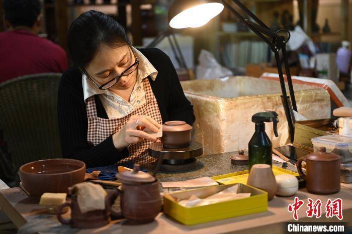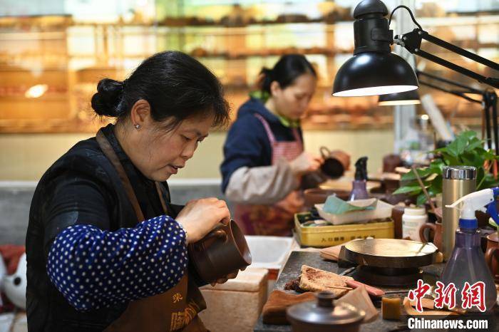 手艺人正在为陶艺作品进行抛光。 陈超 摄