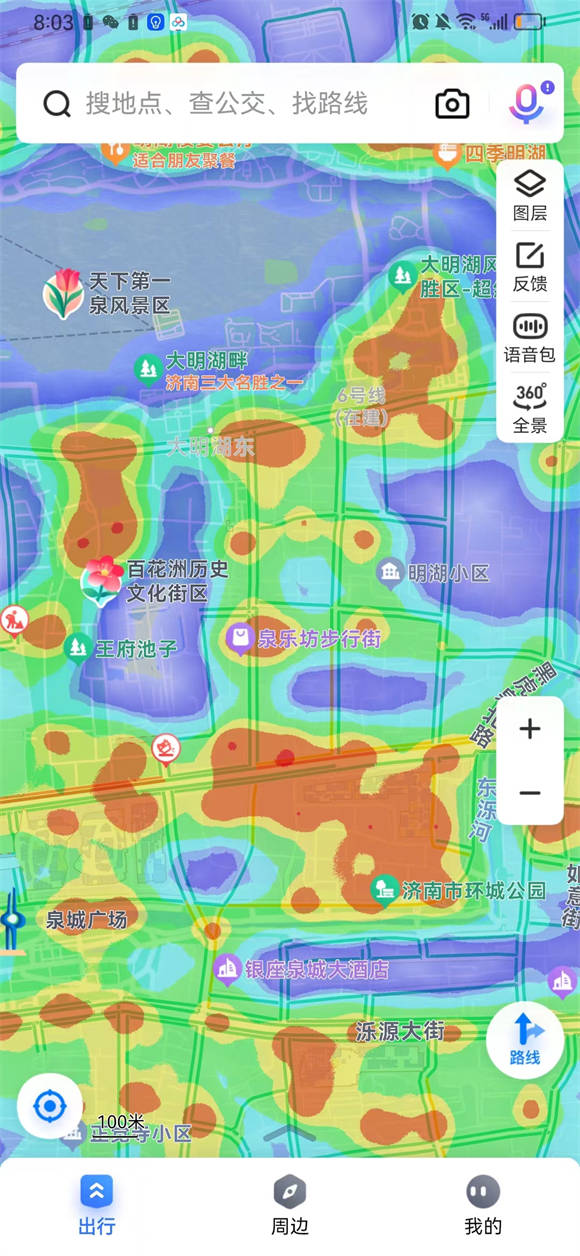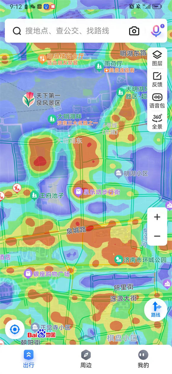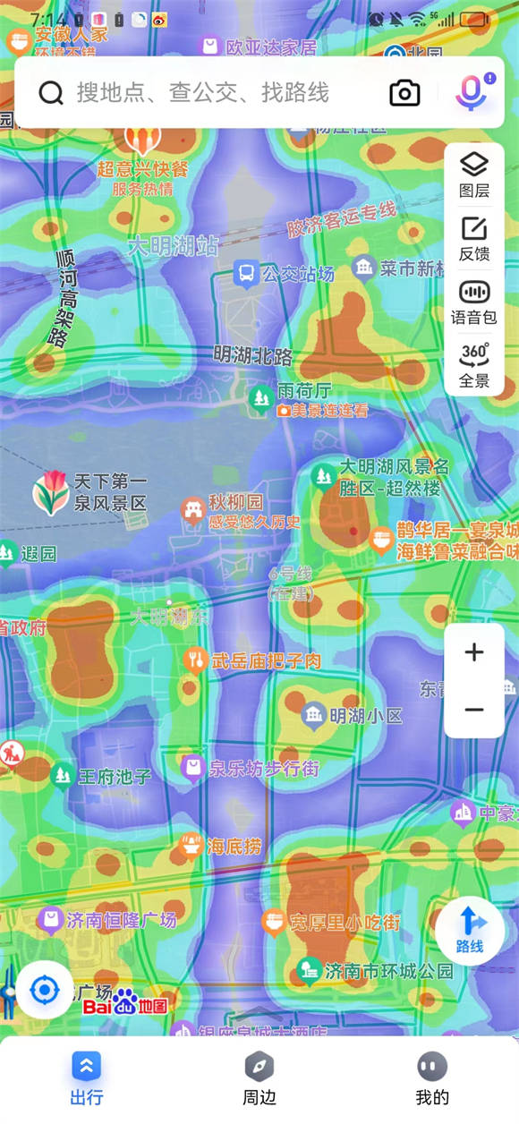 “百度地图”热力图用不同颜色的区块叠加在地图上,以实时描述人群分布、密度和变化趋势,通过观察4月14日晚19点-21点左右超然楼周边的热力图,我们可以发现这段时间市民游客在此区域内活动、聚集的大概范围。随着时间变化,人群在超然楼、百花洲、芙蓉街、宽厚里、泉城广场、泉乐坊步行街等地聚集,为济南夜经济蓬勃发展提供了无限的活力。