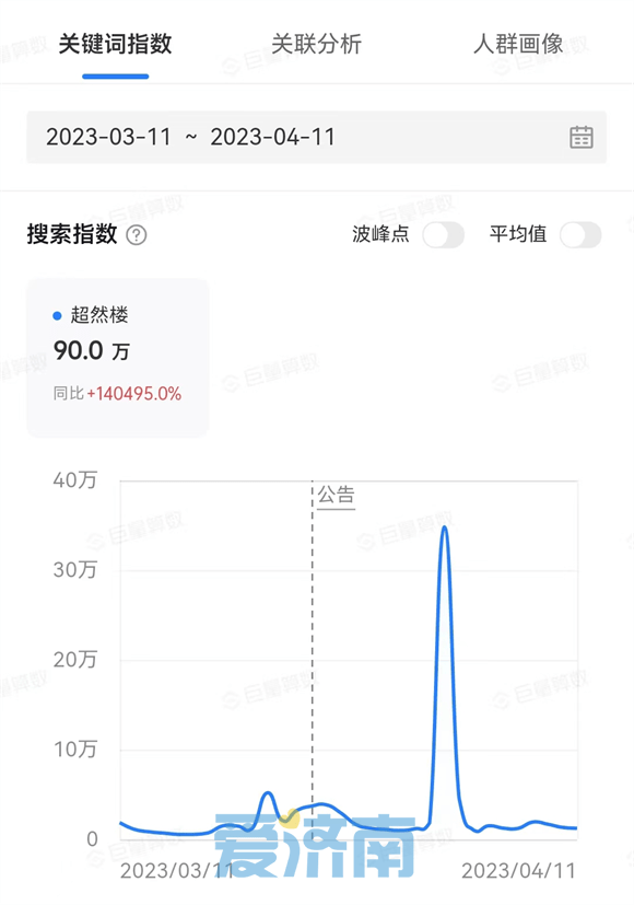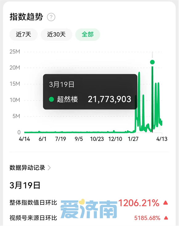 在“巨量算数”小程序查看“抖音关键词”,3月11日-4月11日,超然楼的“抖音搜索指数”高达90.0万,同比增长达到了惊人的140495%;在“微信指数”小程序搜索“超然楼”,其中到达顶峰的3月19日的微信指数高达21773903,日环比上升1206.21%,超然楼可谓火遍全网,而此时距离网友“萤火虫”1月30日在短视频平台上分享超然楼亮灯视频并爆火已过去了近两个月。可以看出,这阵子这座大明湖畔的“江北第一楼”不仅火了,而且火得彻底,火得长久!