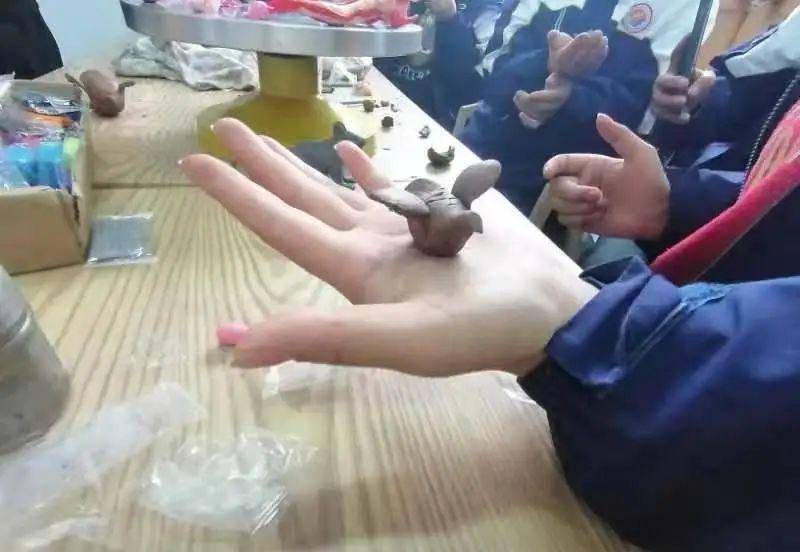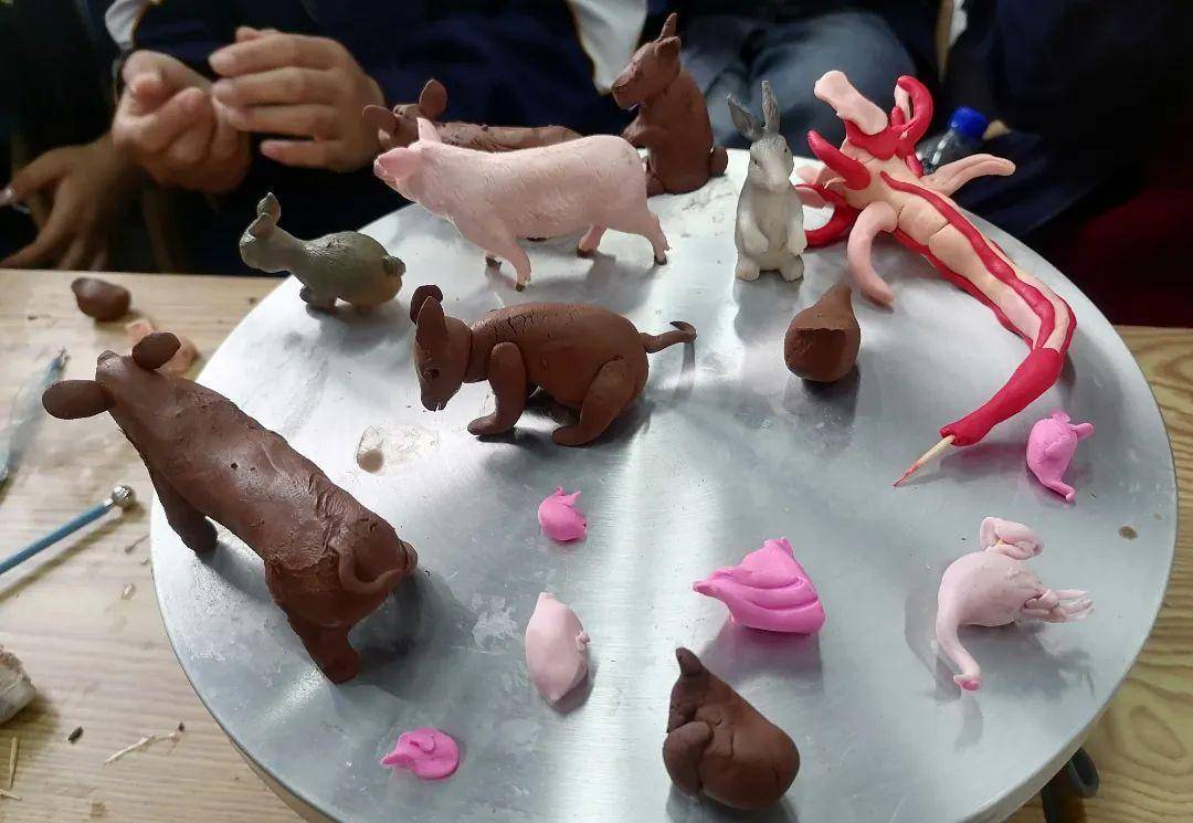 泥塑课堂上,同学们对软乎乎的泥土充满好奇,都迫不及待地用软泥捏出心中理想的奇异造型。在专业老师的指导下,同学们掌握了简单形体捏法的基础,首先从身边喜欢的小动物入手,尝试将各种造型组合起来,构成新奇、独特的泥塑作品。一个个小猪、小兔和小牛泥塑作品,栩栩如生、色彩饱满,别具生命力和艺术感染力。