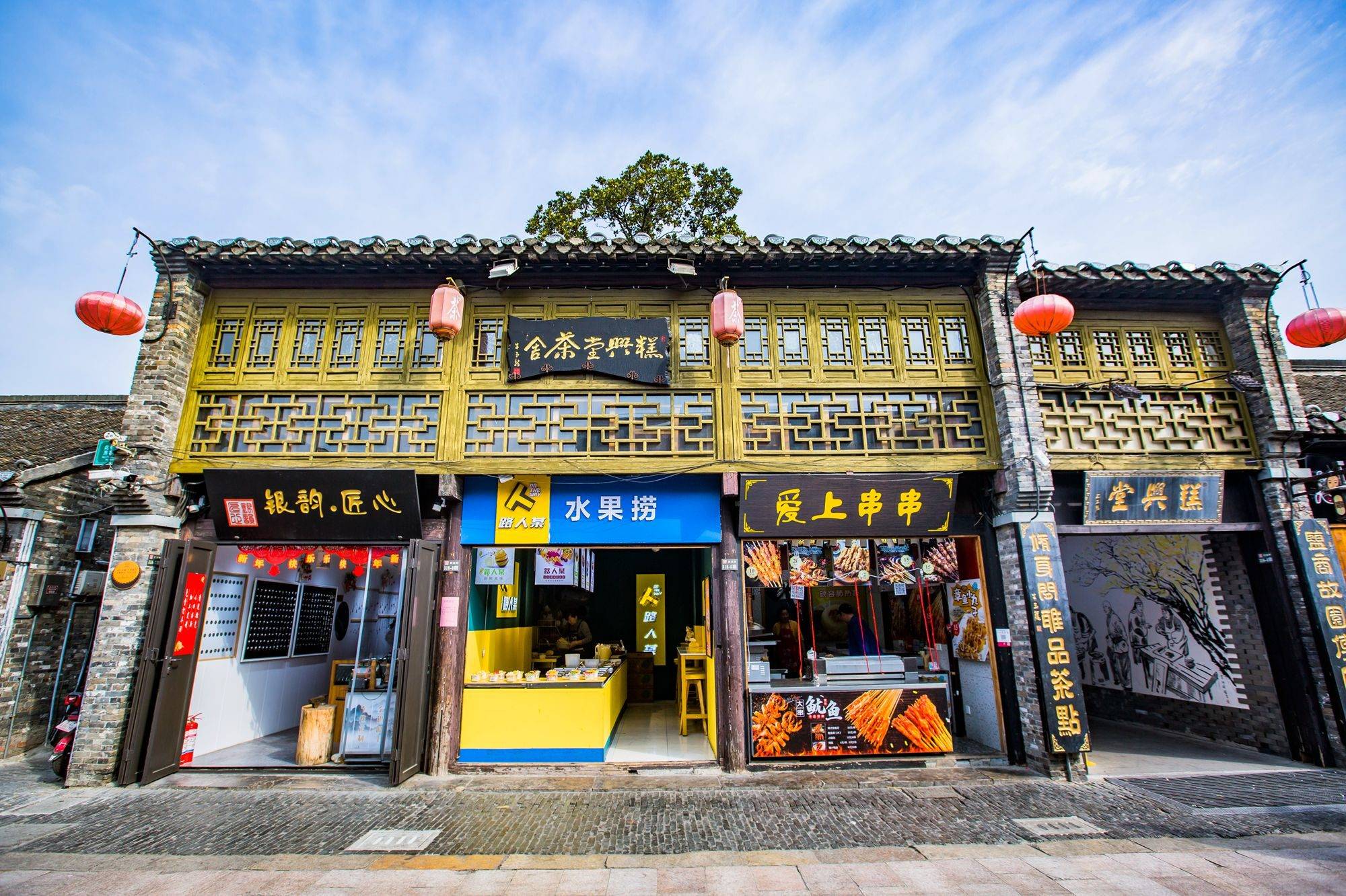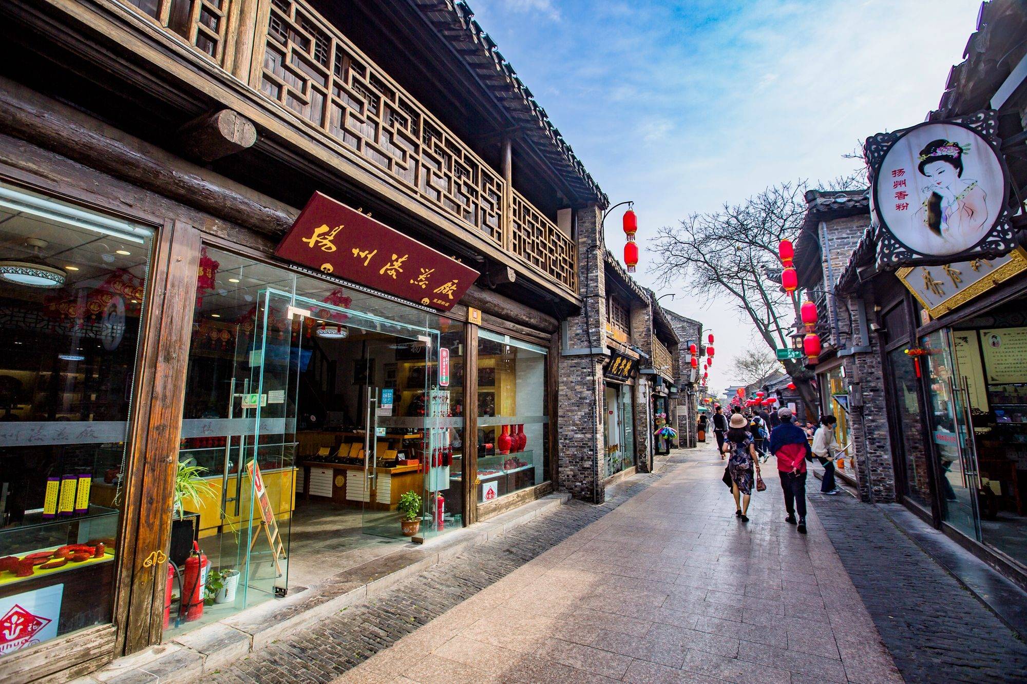 店铺前灯笼高悬,屋顶是鱼鳞状小瓦,一行一行排列得整整齐齐,走在街上,总好像走进了杜牧的“春风十里扬州路”。