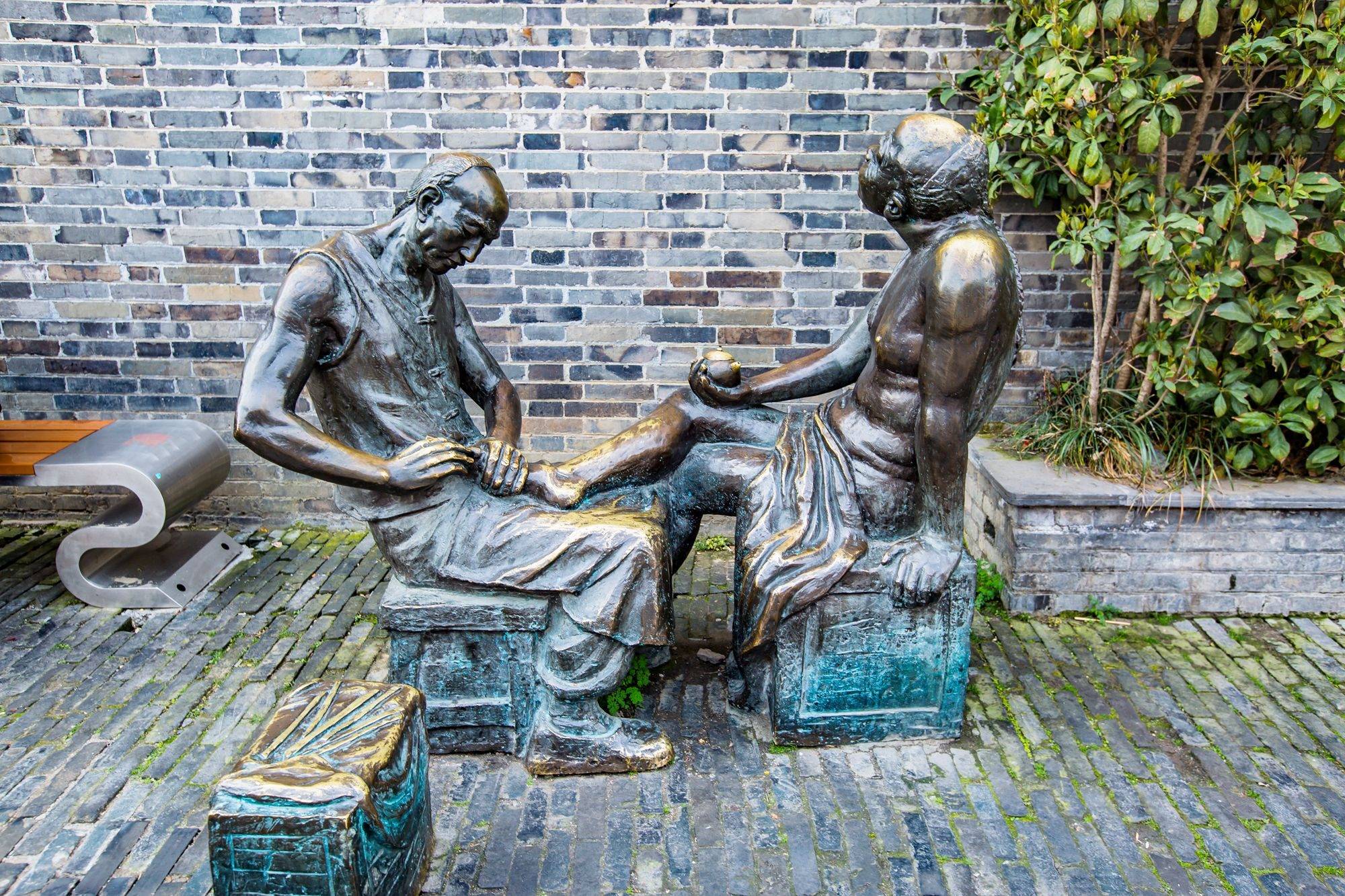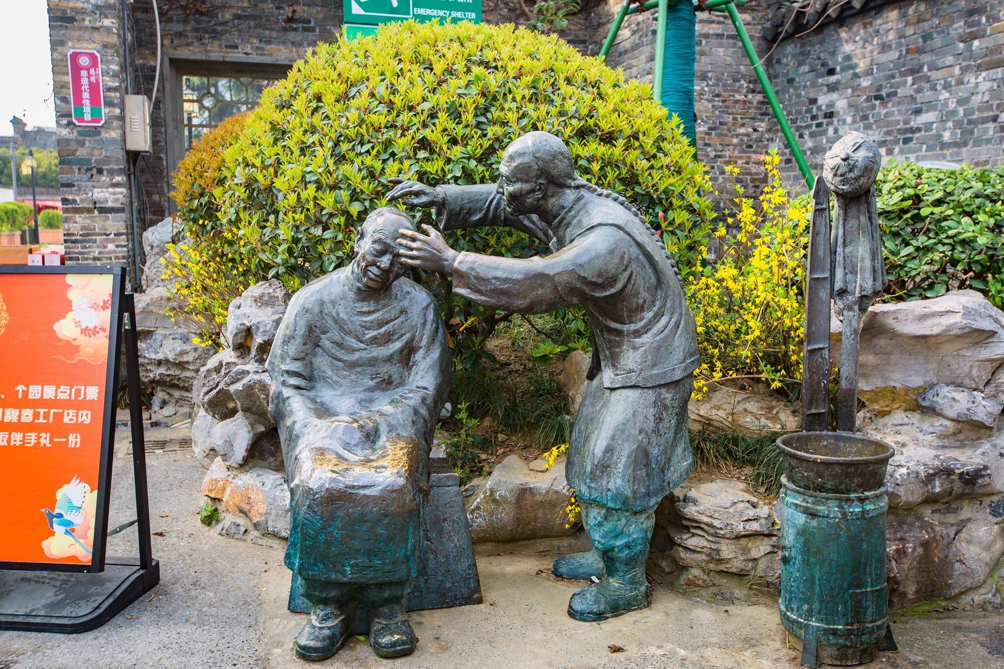 街巷两侧,时不时偶遇一组雕塑小品,演绎着精致扬州的另一面——烟火市井气。扬州人爱享受会享受,以“三把刀”——剃头刀、厨刀和修脚刀闻名全国。修脚、洗浴等休闲业自古在这里就相当发达,而修脚早已不是一门生意,而是通过望、问、触、摸修治足病的手艺和学问。