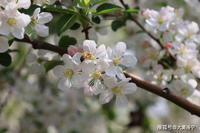 一朵朵苹果花在春风中自在摇曳,引来勤劳的蜜蜂采撷这春日的甜蜜……