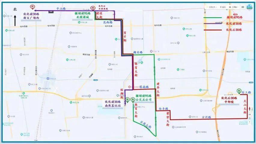 结合两条线路客流特点,为减少中山路繁华路段线网密度,解决河北化工学院、翡翠四季小区到中心商圈的出行需求,同时增强方兴路公交运力,拟采取线路优化重组,将30路始发站延至中仰陵停车场运行,终点站缩至北国商城,线路合并重组后,95路原途经建华大街、槐安路段有57路、71路等公交线路覆盖运营。