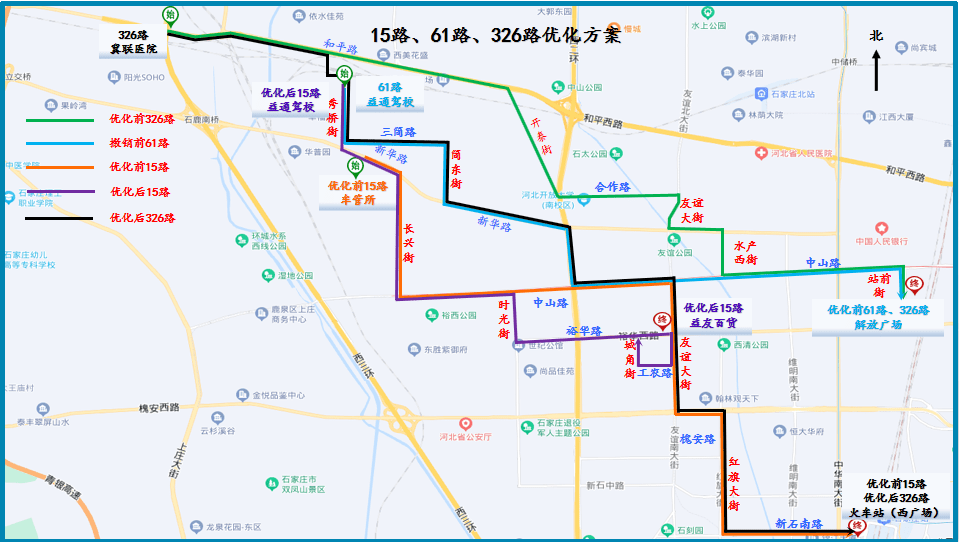 根据线路走向分析,三条线路在中山路部分路段彼此相互重叠,拟对15路、61路、326路优化重组,将326路调至瑞桥街、三简路、西二环、友谊大街、红旗大街衔接火车站运行,全面覆盖15路、61路线路功能,解决和平路康庄、幸福城小区及南简良东街沿线居民到达槐安西路、红旗大街的出行需求;将15路起止点调整为益通驾校至益友百货,填补时光街、城角街公交空白,降低中山路西段公交重复系数,提升运行效率。