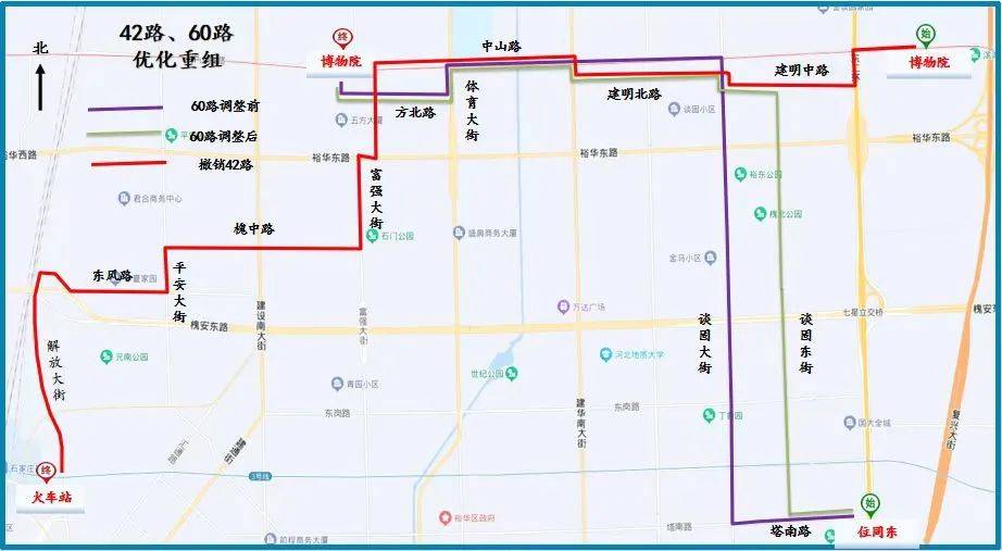 结合OD客流数据分析,42路线路客流特征主要为建明北路、建明中路沿线前往中山路沿线接驳换乘。60路线路客流主要特征为东岗路前往建华大街沿线。通过线路走向分析,42路在中山路与多条线路重叠,60路在谈固大街与82路完全重叠。 拟对42路、60路优化重组,将60路调整至谈固东街、贯穿建明路运行,衔接省中医院、市人民医院方北院区,方便沿线居民出行,42路撤出路段均有公交线路覆盖。