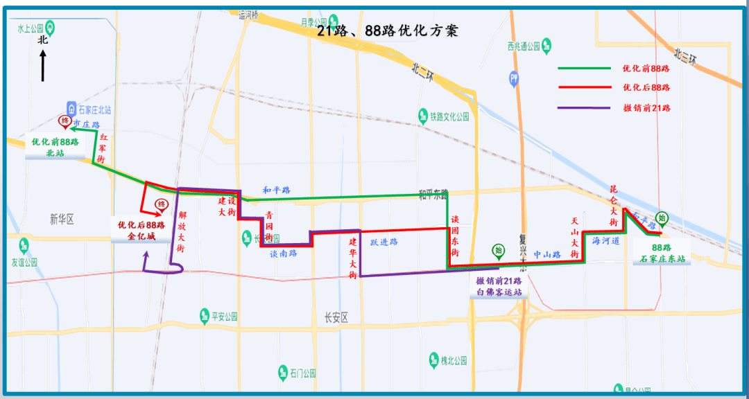 起止点:始发站石家庄东站不变,终点站由北站调整为金亿城。