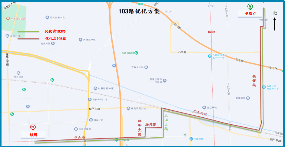 103路由谈固开往中塔口,在中山路(谈固公交枢纽站—天山大街)与28路、553路等线路基本重叠,日运行56个班次,日均客流为1200人次左右,每班别21人次。 拟将103路调整至珠峰大街、辽河道、天山大街复原线运行,填补道路公交空白,方便沿线锦昊昊庭、柠檬郡等小区居民出行及换乘地铁,撤销的天山海河道口、天山中山路口站位均由88路弥补,同时减少天山大街公交线路重叠密度。