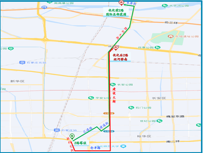 结合建设大街运行的92路与地铁2号线重叠7站,与2路重叠15站,公交与地铁基本完全重叠运行。 拟对2路、92路合并重组,将2路贯穿建设大街运行,增强仓丰路沿线线网密度,方便绿家小区、河北师大师生前往北国及中山路商圈的出行。线路优化后,胜利大街北段到北国商城地带可以乘坐131路、148路,92路撤出的南段由优化的2路补充,对乘客不会造成太大的出行影响。