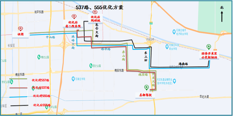 537路由名都驾校开往谈固,553路、555路分别由经济技术开发区枢纽站开往谈固,在中山路(天山大街—谈固公交枢纽)基本重合,结合3条线路OD客流数据分析,出行需求均为开发区沿线前往海世界、同祥城地带(地铁留村站),仅有部分客流前往中山路核心区。 拟将537路优化至省二院东院运行,555路优化至同祥城运行。