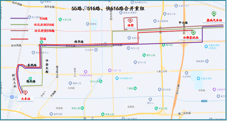 依据OD客流数据分析,55路的线路客流特征主要为中山路前往裕华东路沿线客流,516路的客流特征主要为藁城至火车站需求较高,快516路的客流特征主要为藁城至石家庄东站及谈固。且55路、516路、快516路彼此在中山路、裕华路相互重叠运营。 拟对55路、516路、快516路三线整合优化,保留快516由至谈固,并延伸至裕华路、平安大街行驶,采取大站停靠方式快速直达火车站,全面覆盖55路、516路线路功能,方便藁城区域居民快速到达主城区的出行需求。