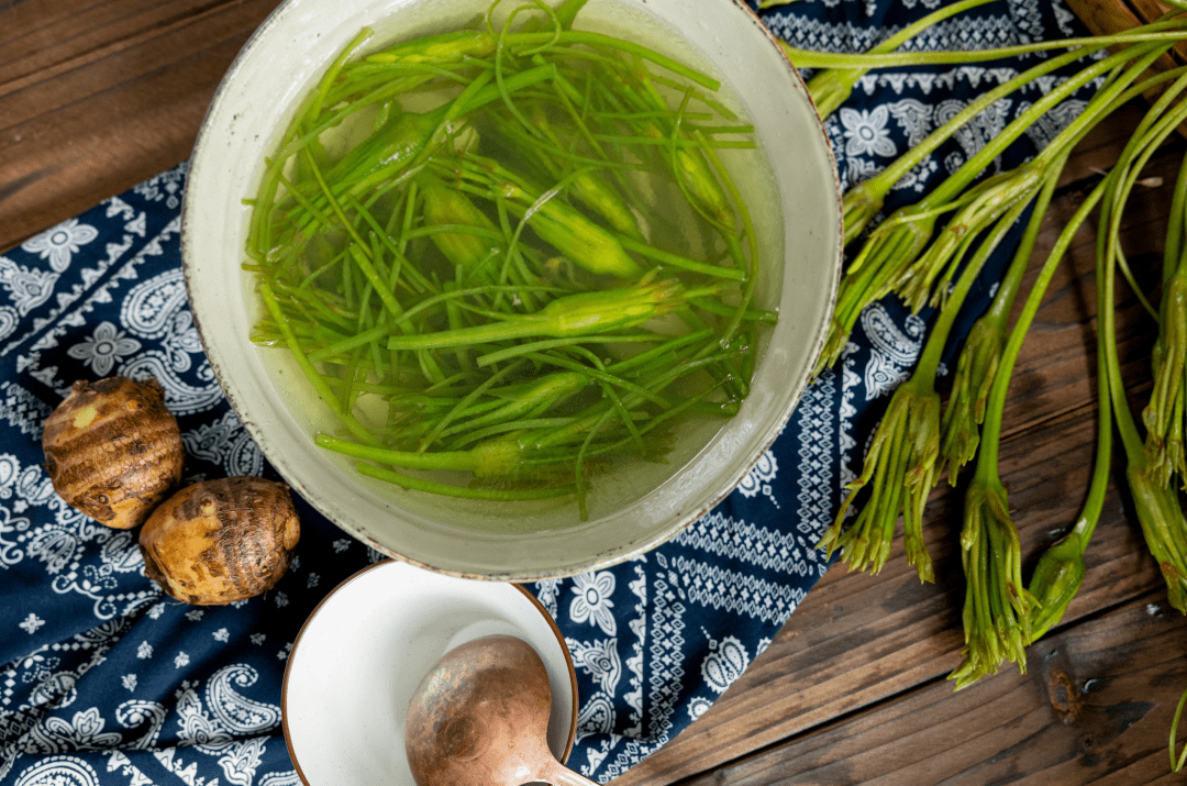 水芹菜也是董超宇爱用的一种蔬菜,它长在滇池、抚仙湖、玉龙湖湿地的边上,本来是拦泥沙的好植物,却发现也是餐桌上的好野菜。它比其他省份的水芹菜最细嫩的梗还要单薄,直直地竖起来就左右摇摆,不经风。云南本地人用干辣椒和豆豉一起炒。董超宇为了让我们吃得清晰,只用豆豉凉拌了一下,它同芹菜的香气不一样,要清新一些。这种独特的香气,是董超宇的秘密武器,做鱼时候能把鱼的腥味逼出来,做汤时又给汤里增加了鲜味。