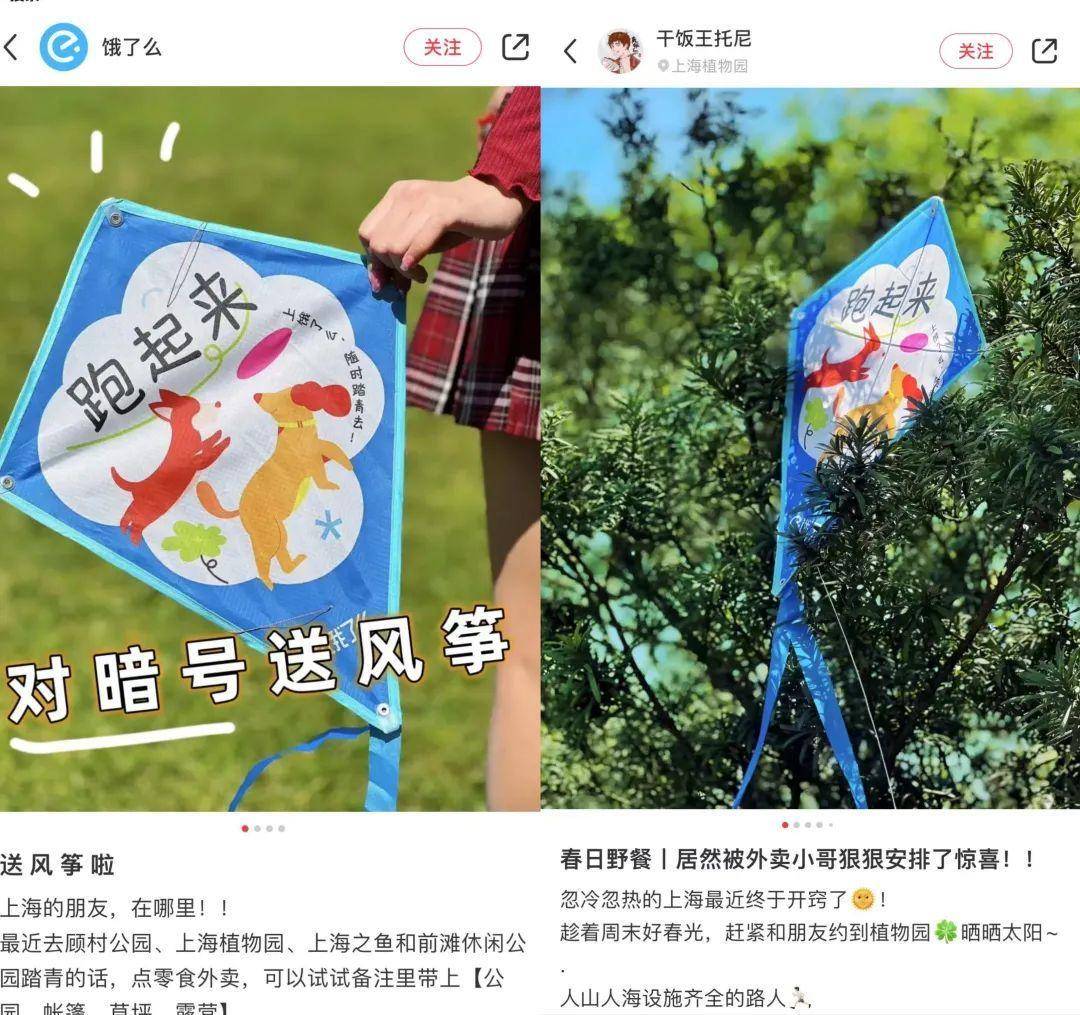 在嘉定紫气东来体育公园,不少游客更是直接用饿了么下单风筝外卖送到公园,即兴放风筝。近日有网友发现,在上海部分公园点外卖,会额外收到外卖小哥配送到的惊喜风筝,为即兴踏青增添了“意外惊喜”。