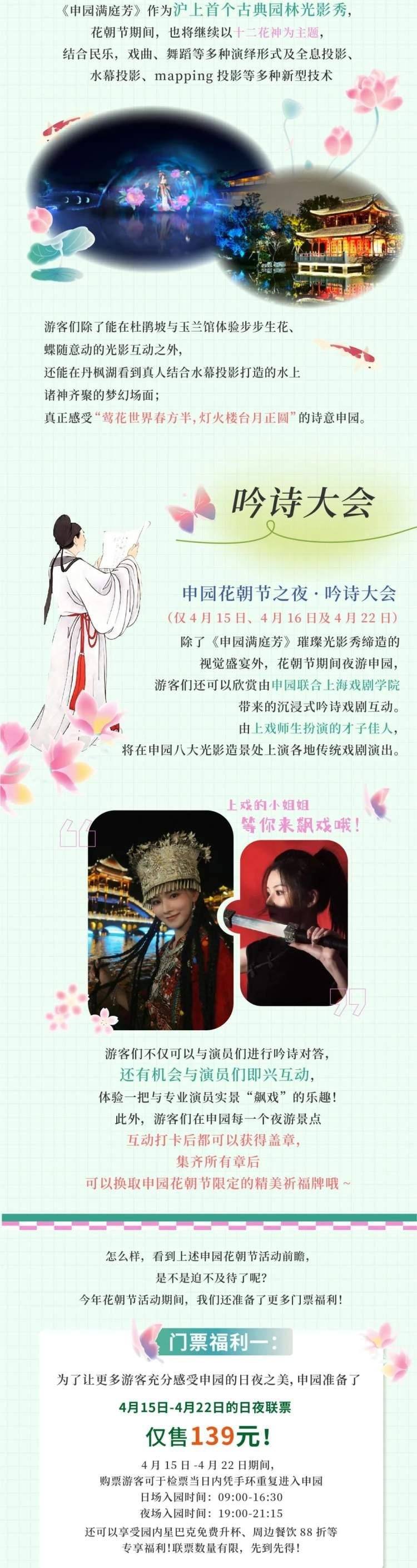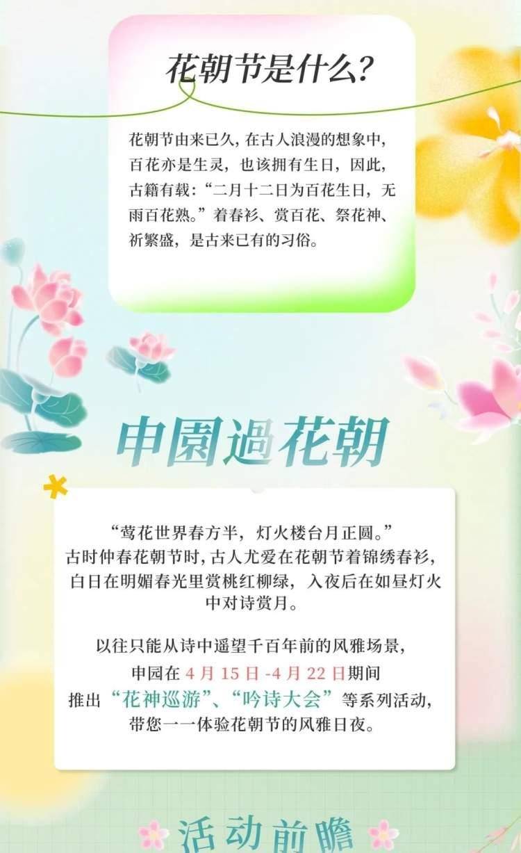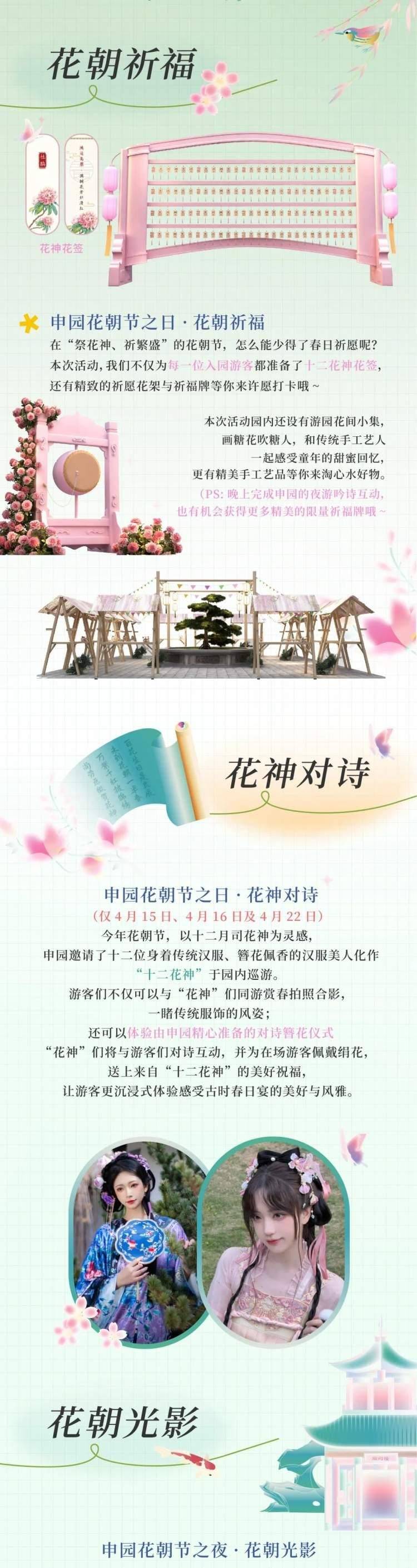 春和景明的时节,申园的百花开得繁盛,无论是白日的姹紫嫣红,还是夜里的光影惊鸿,都别具韵味。“申园满庭芳”将于4月15日-4月22日,推出花朝节吟诗大会主题活动,与市民游客共赏申园满庭风雅。逢周末,满园男女花神现身,身着华裳和游客对诗互动。