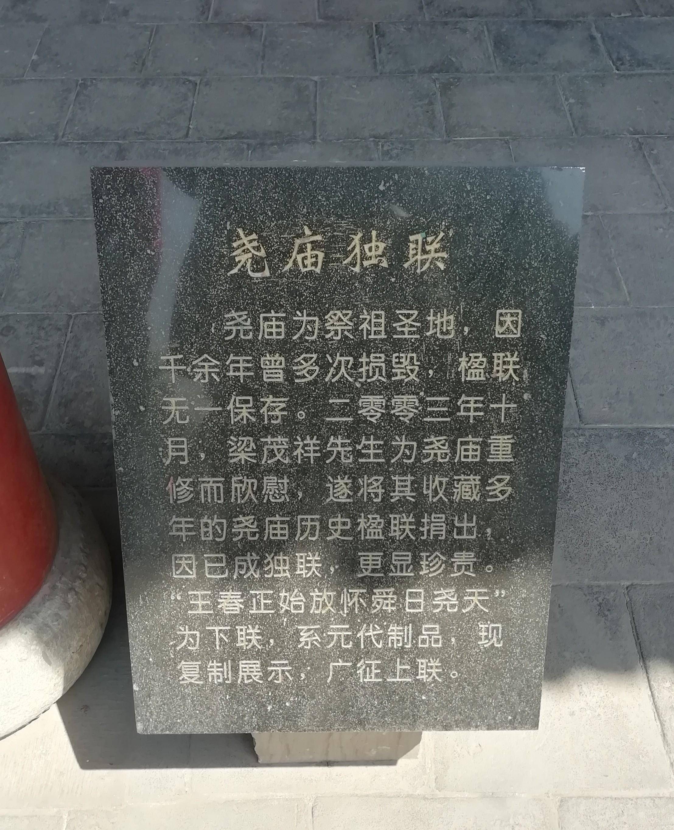 尧庙始建于晋代,系中国首座国祭帝尧、民祭尧舜禹的庙宇,俗称“三圣庙”。可惜的是,因千余年曾多次损毁,楹联只有元代的“王春正始放怀舜日尧天”(下联)这一独联保存下来。