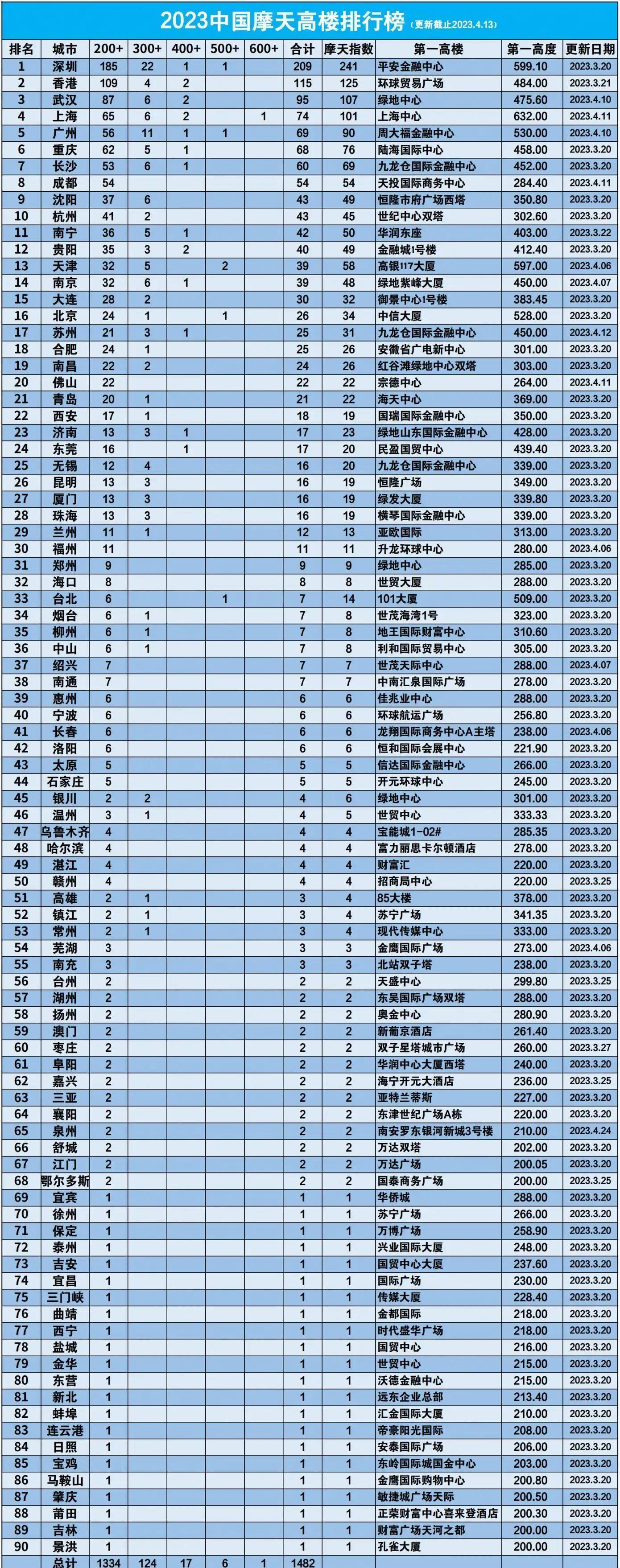 另外有400米级高楼2座,300米以上高楼32座,200米以上高楼111座。