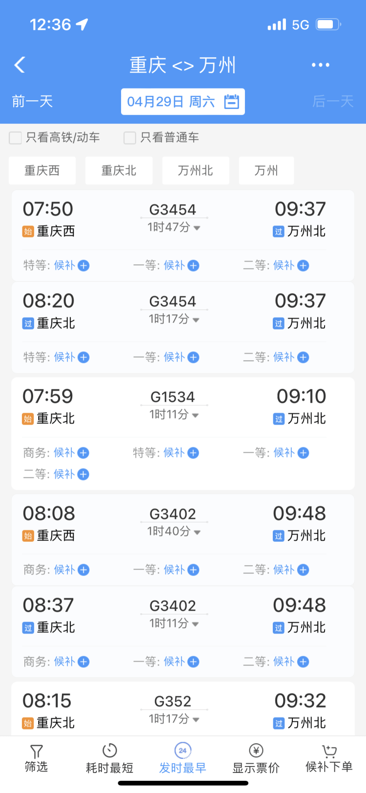 △重庆出发到贵阳部分车次车票已进入候补状态