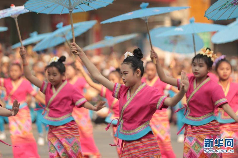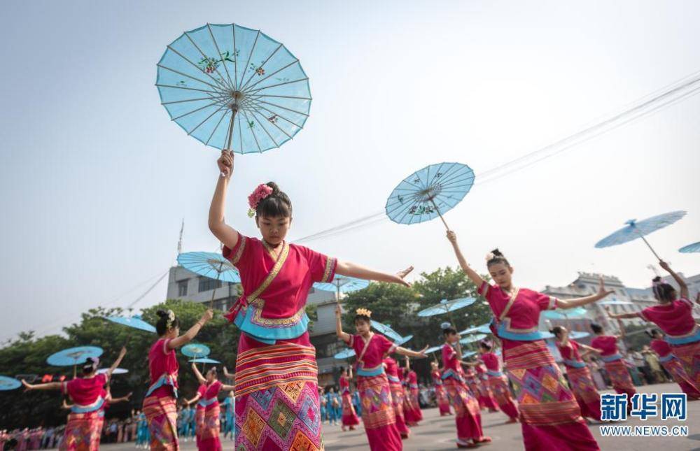 云南景谷采花泼水节千人赶摆方阵表演(4月14日摄)。新华网发(景谷县融媒体中心供图)
