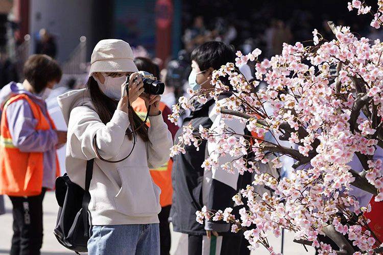 朵朵杏花悄然绽放,游客赏花拍照。新京报记者 陶冉 摄