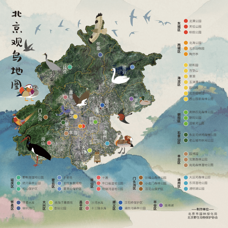 结合爱鸟周宣传活动,北京市园林绿化局现场发布了《北京观鸟地图》,推出了北海公园、翠湖湿地公园、房山十渡、延庆野鸭湖等45处鸟类资源丰富的观鸟点,为观鸟和拍鸟爱好者提供了指引。