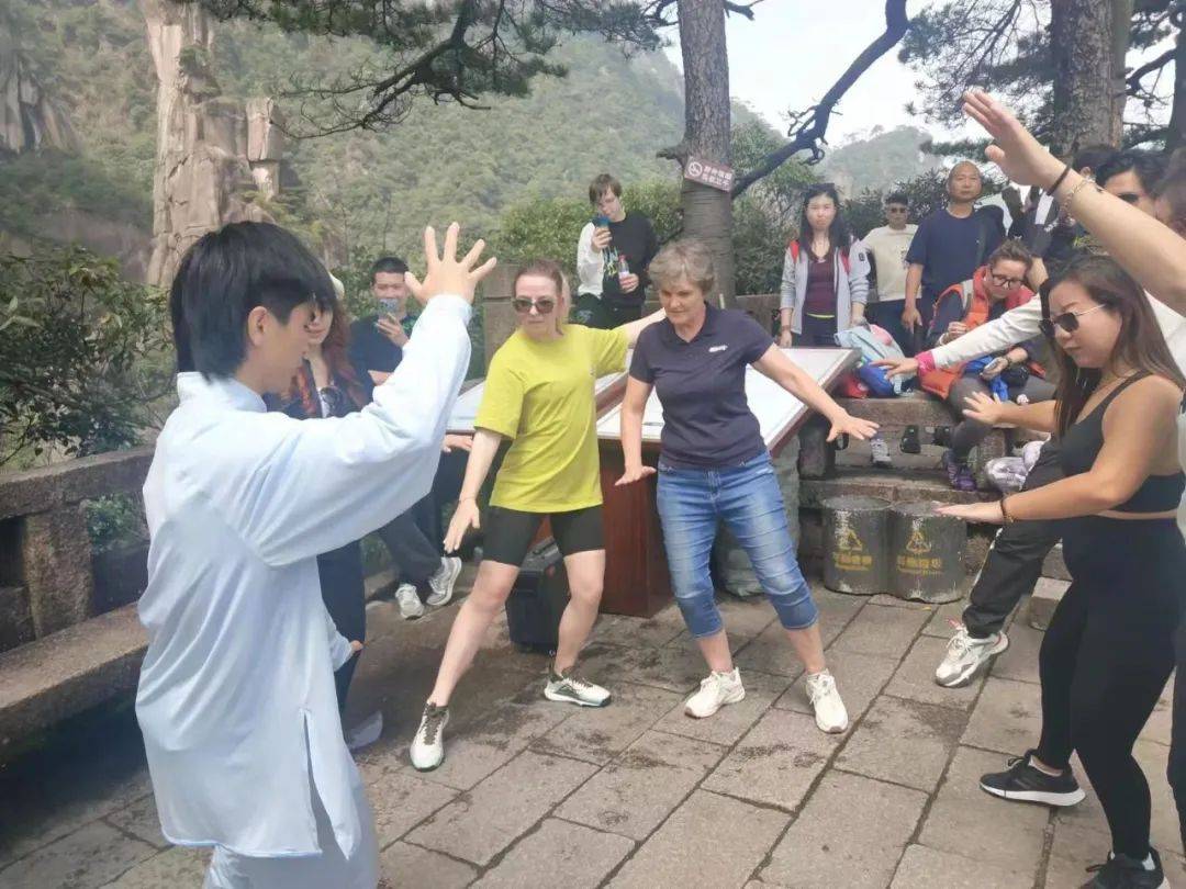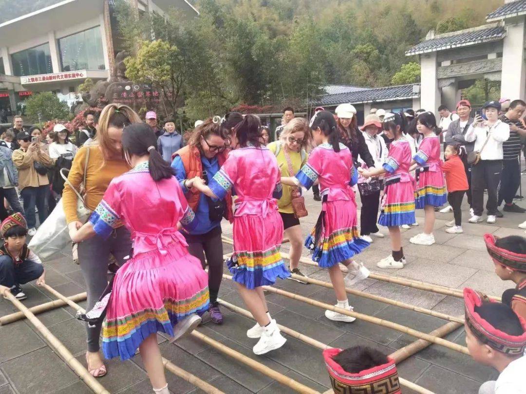 当天,雨后初晴的三清山格外秀丽,游人广场、核心景区等地游人如织,奇特的巨蟒女神峰、壮观的云海雾涛极大的震撼了入境旅游团一行,与此同时景区丰富多彩的畲族舞蹈、太极表演等中国传统的民俗文化也引发了他们浓厚的兴趣。在现场表演人员的热情邀约和指导下,这些来自英国、德国、加拿大等国的游客们兴致勃勃的参与体验了畲族竹竿舞,在太极拳的一招一式中感受博大精深的中华文化。