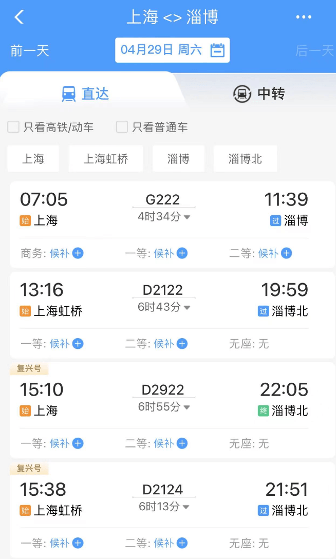 4月15日12点30分,北京-淄博火车票开始预约抢票,不到5分钟基本售罄,只剩余少量无座票。 中国青年报(ID:zqbcyol)通过12306网站查询发现,4月29日当天前往淄博的高铁和普通车票,几乎全是候补状态。