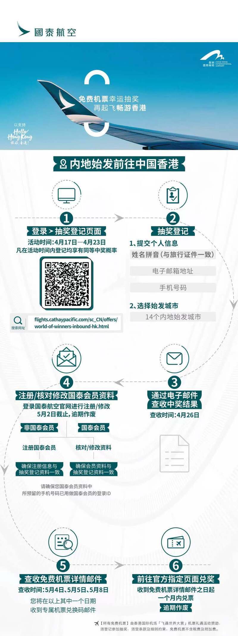 4月17日至4月23日,国泰航空将率先开启第一阶段由中国内地始发前往中国香港的抽奖登记。届时参与者可在该时间段内登录国泰航空指定活动页面,提交个人信息(与旅行证件一致的姓名、电子邮箱及电话号码),并选择始发城市参与抽奖,即有机会赢取免费的由中国内地始发前往香港的经济舱往返机票。抽奖结果将于4月26日通过电子邮件公布,抽到免费机票的旅客可再根据指引选择出发日期。
