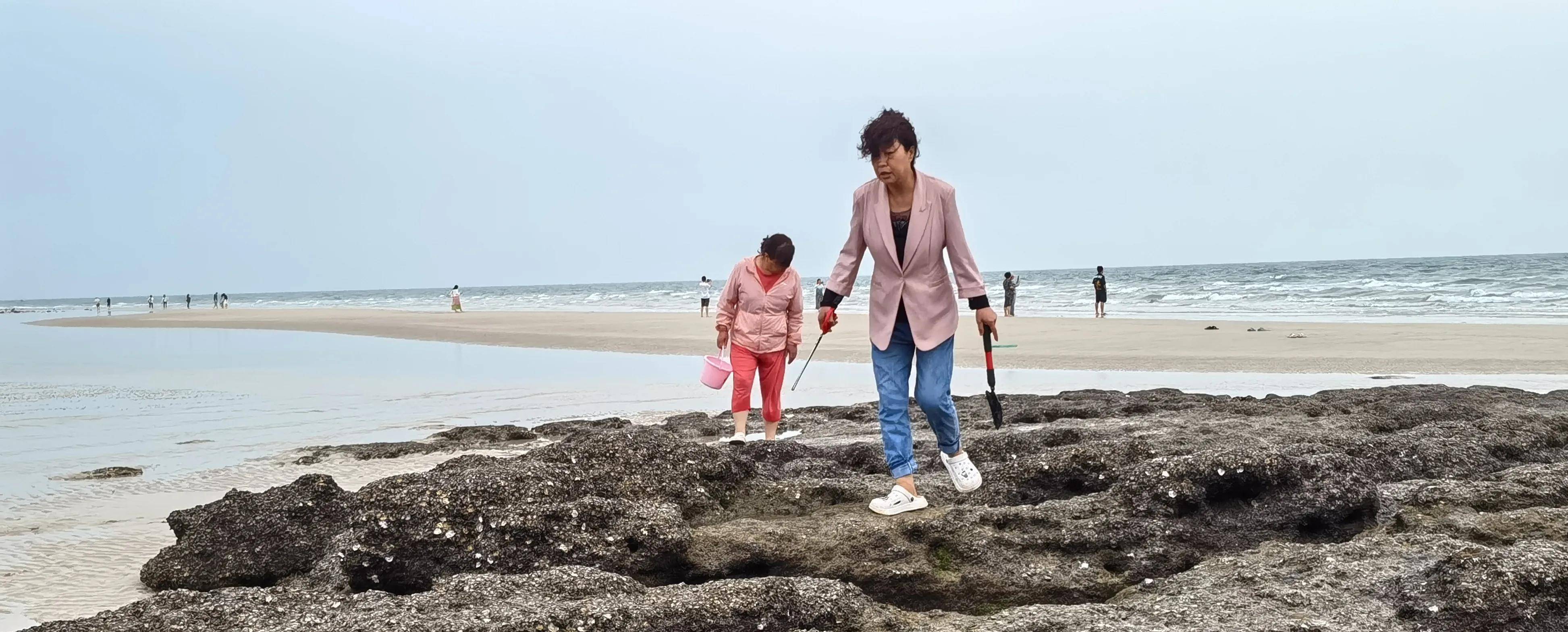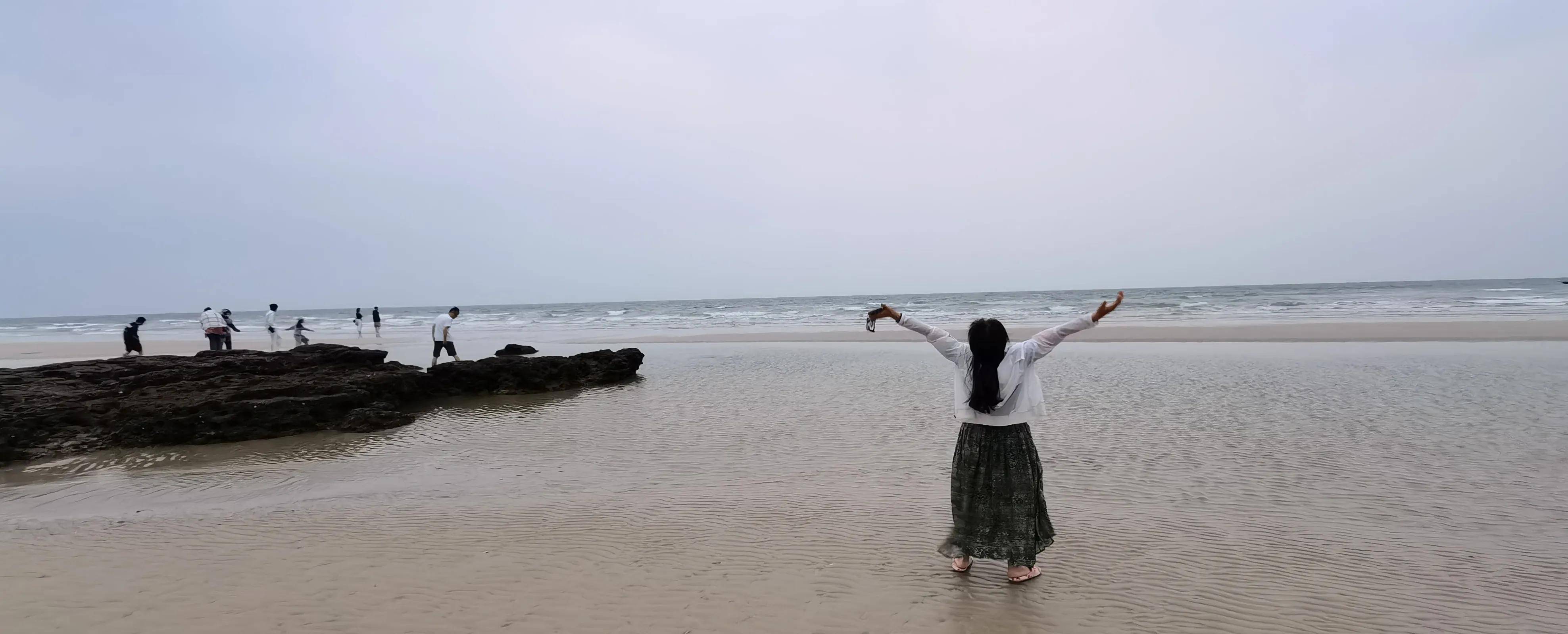 原来女子是来自四川,拍过照片,女子款款走入她们的团队,在海浪与沙滩交汇处观海。