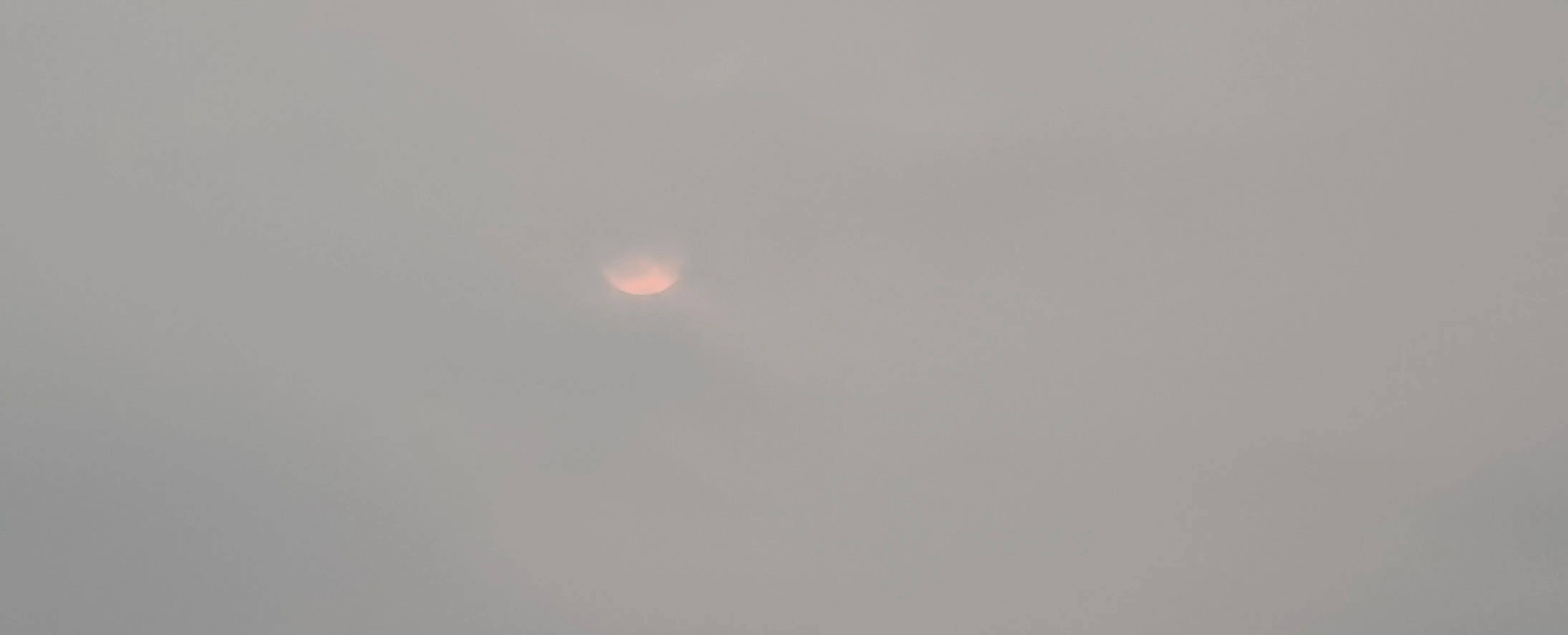 由于云层密布,太阳始终没有露面,直到临近8点,太阳才从云层冒了一下头,这时,它已距海面老高了。只闪了一下,便又躲入云层不见了。