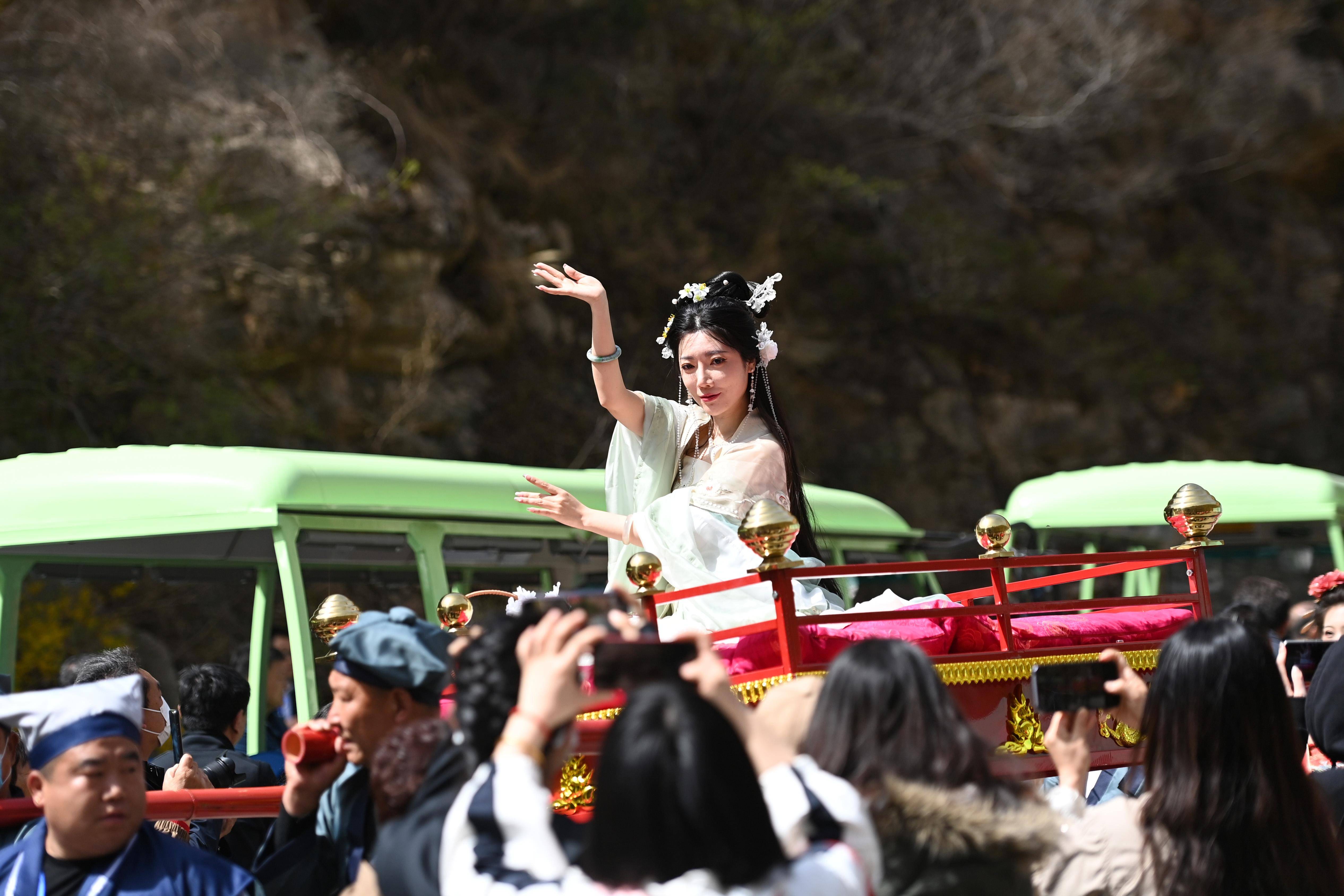 4月15日,游客在天津市蓟州区梨木台景区观看汉服表演。 新华社记者 赵子硕 摄
