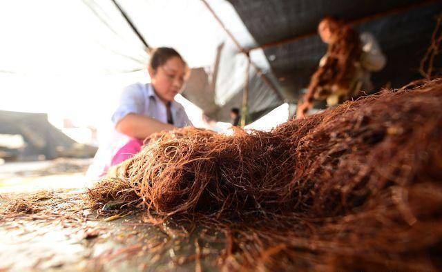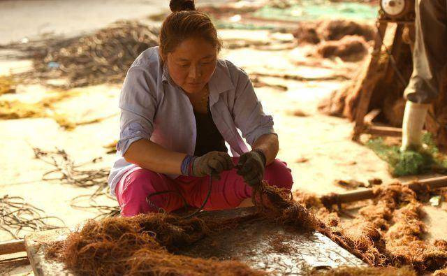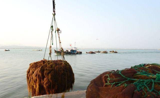 在山东省威海市荣成市桑沟湾一家码头,这里的渔民正在往绳架上夹龙须菜苗,送到海里养殖。
