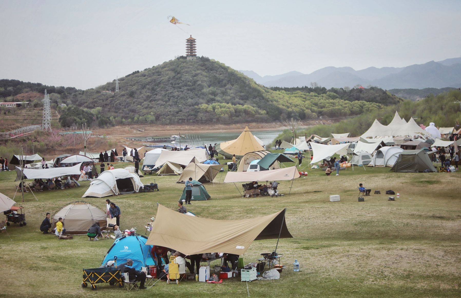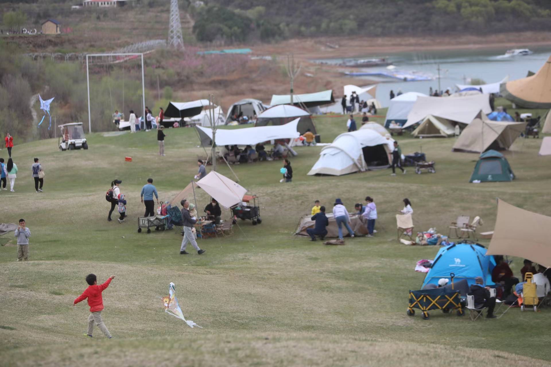 4月15日,平谷区金海湖荒野7号露营地,游客们搭起帐篷享受春日美景,当天,第二届金海湖营地文化消费季启动。新京报记者 薛珺 摄