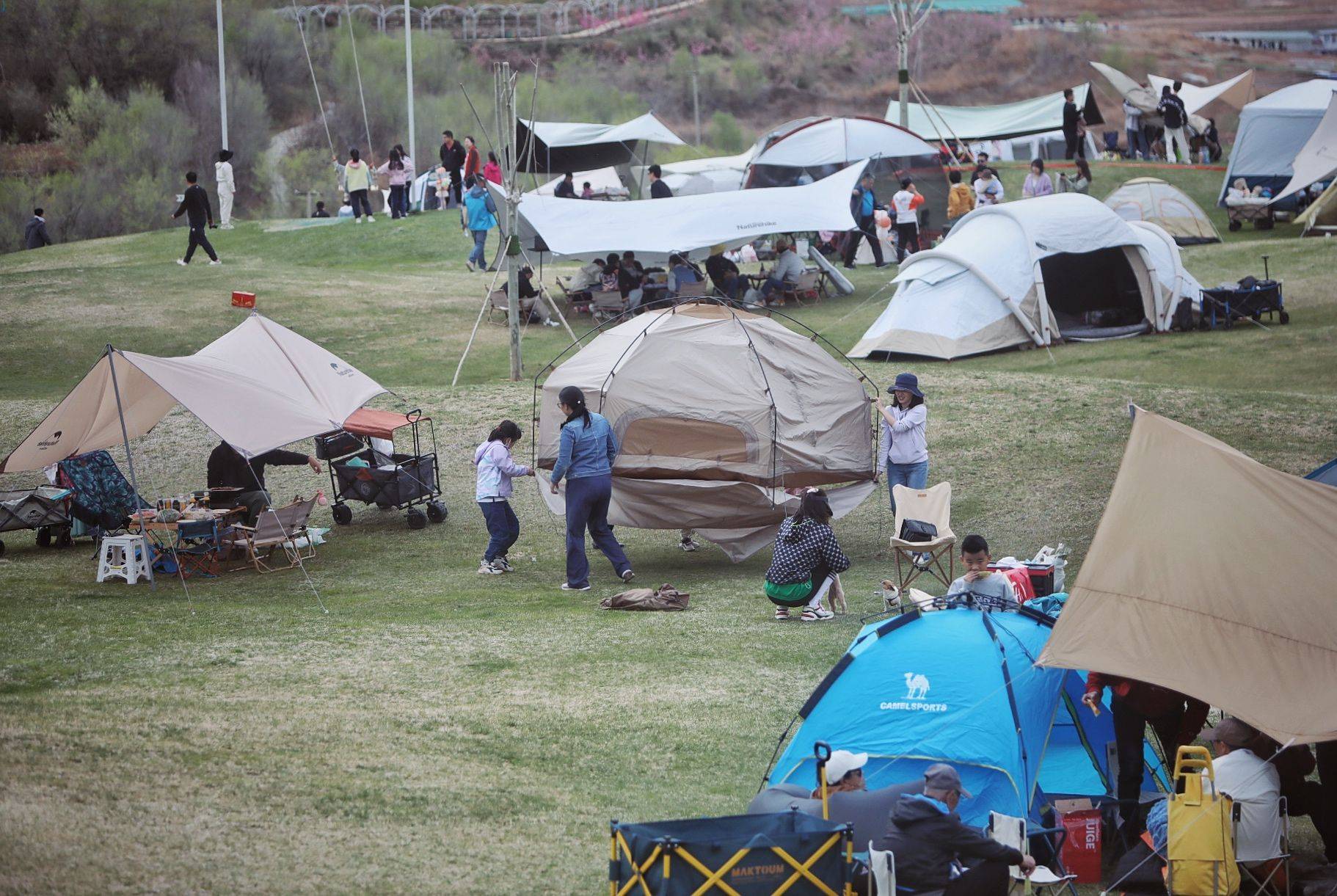 游客们在露营地享受春日美景。新京报记者 薛珺 摄